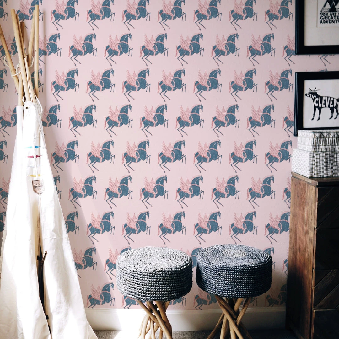 This fanciful design features the fabled winged horse prancing along, inviting you to make up your own story as the inspiration arises. The motif offers a starting point, and you can do the rest. What does the pegasus bring to mind for you? Available in either navy and pink or peach and blue colourways. Transform your home into a stage where reality and imagination merge.