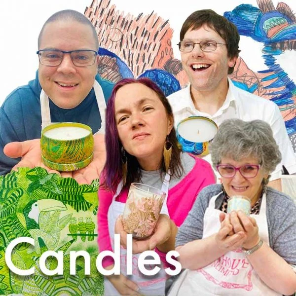 This vegan plant wax candle has been specially made in the UK for ARTHOUSE Unlimited, and has no animal or paraffin-derived ingredients. The beautifully adorned glass casing is completely reusable. Once you’ve finished burning the candle, just clean thoroughly and it can be used as a beautiful glass or vase. This candle features artwork created by a collaboration of ARTHOUSE Unlimited artists.