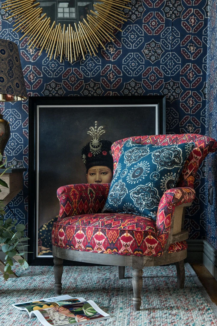 A beautiful multicolour design inspired by traditional handwoven Uzbekistan Ikat silks. These bold kaleidoscopic patterns have been adopted into the modern Farmhouse look adding a depth and weaving into our cultural psyche. Printed on a robust heavy weave linen.