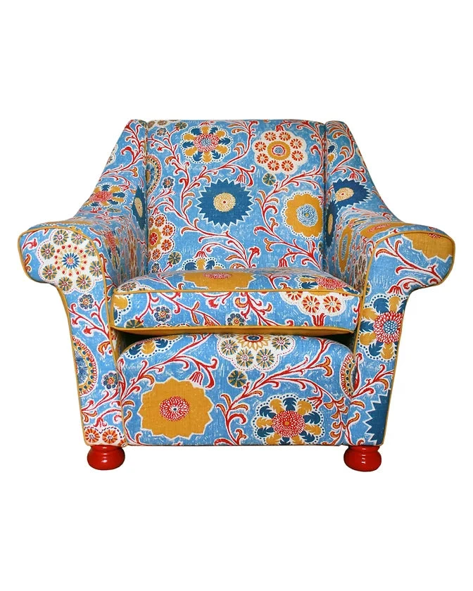 A classic mid century G-Plan armchair newly upholstered in original hand printed Nomad linen in Jamboree. Resting pretty on red lacquered wood bun feet.Â