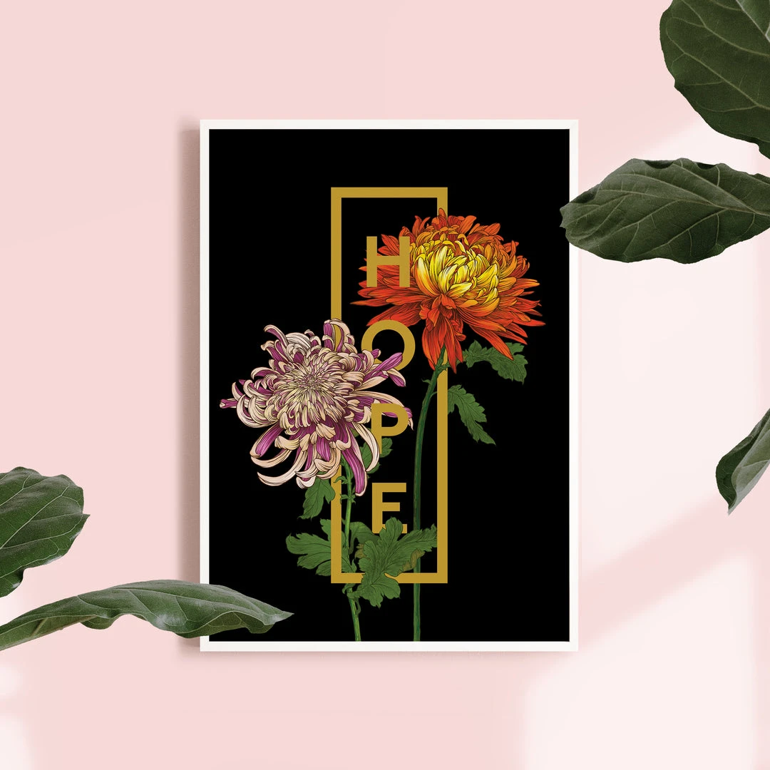 All there is, is hope. Brighten yours orΒ a loved one’s home with this beautifully designed HOPE print with Chrysanthemums.Β Chrysanthemum flowers symbolise longevity, joy and optimism. It is the November birth month flower and the 13th wedding anniversary flower.