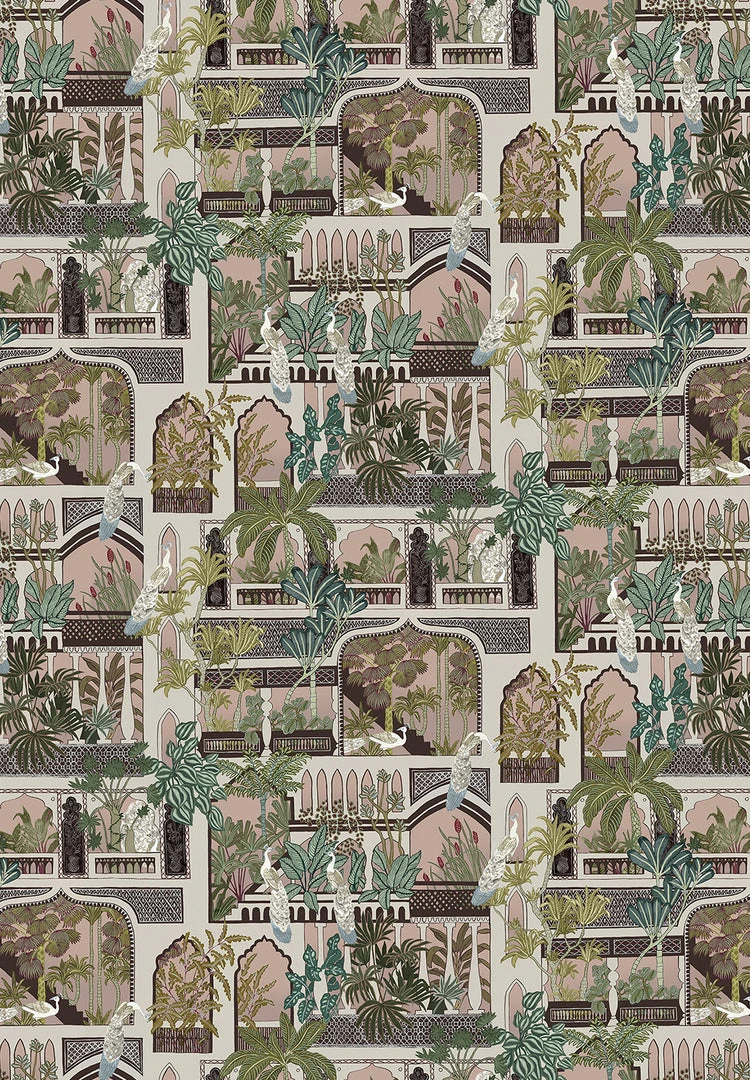 This wallpaper design was inspired by Indian architecture. It is bought to life with lush foliage and playful peacocks. This pattern has traditional geometric pattern set in architectural Doorways and Windows. All meticulously hand painted.