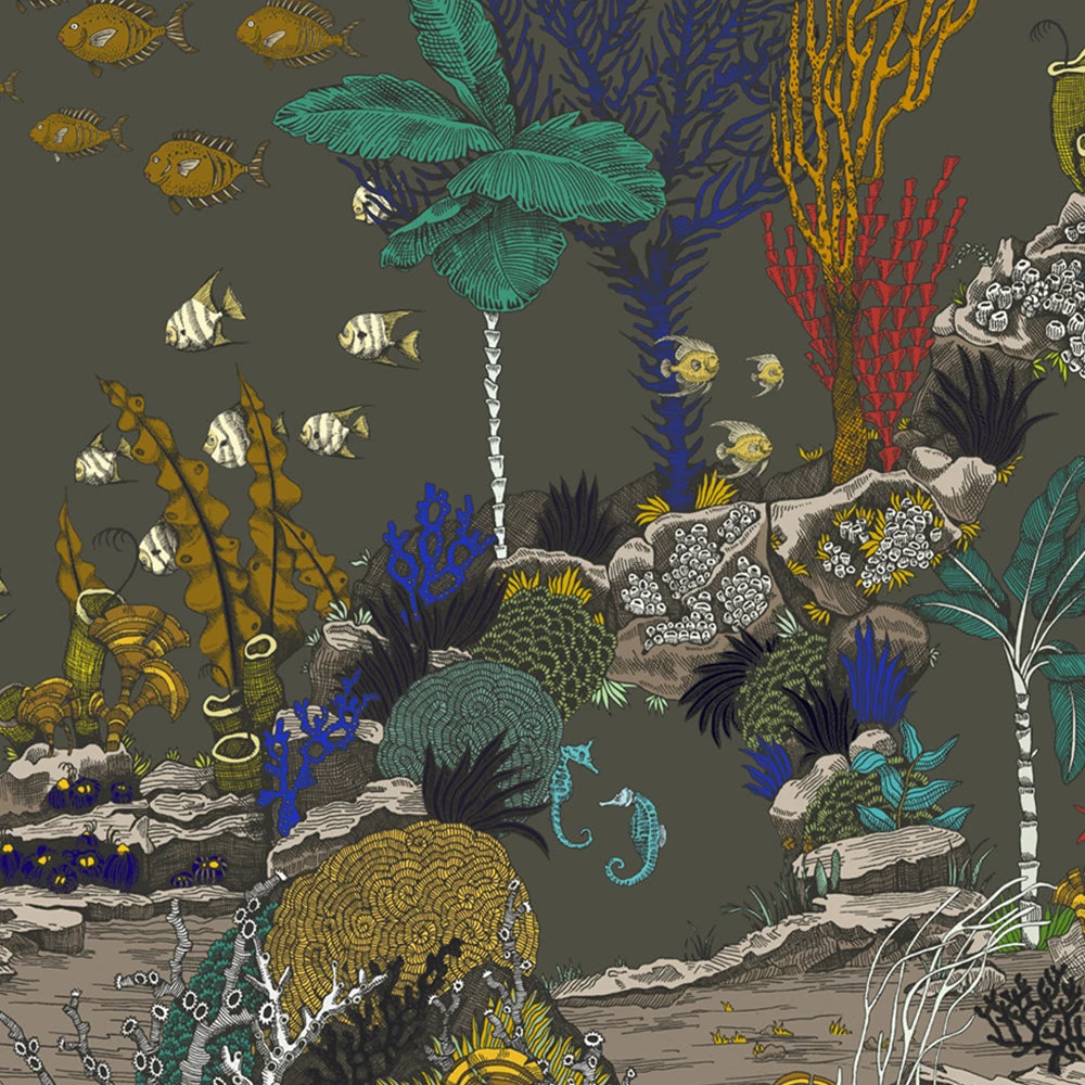 This wallpaper design was inspired by a trip to Belize. Underwater and on-shore vegetation blurred into one. As my drawings progressed, this magical underwater jungle slowly appeared.