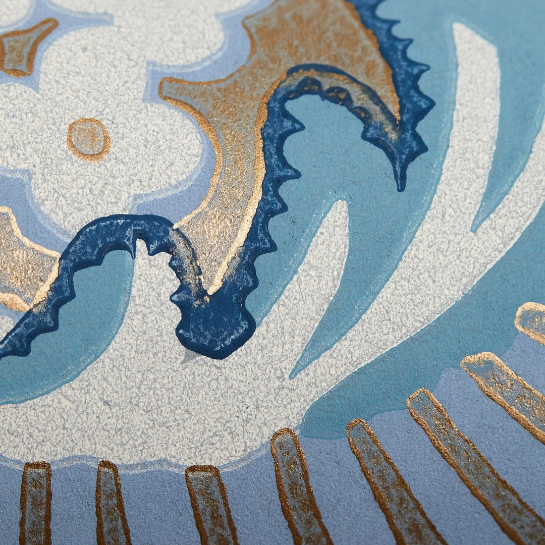 Patricia is a richly stylised and exquisitely detailed floral, created in the 1990s and inspired by the Indian chintz patterns that first came to Europe at the end of the seventeenth century. Patricia appears reimagined as a wallpaper design, using a surface print technique. Its natural matte colour is inspired by plant dyes, sitting alongside soft metallic pigment to provide subtle matte and shine.