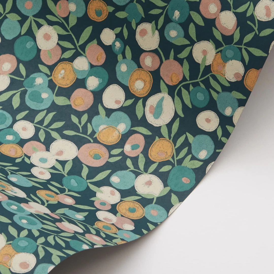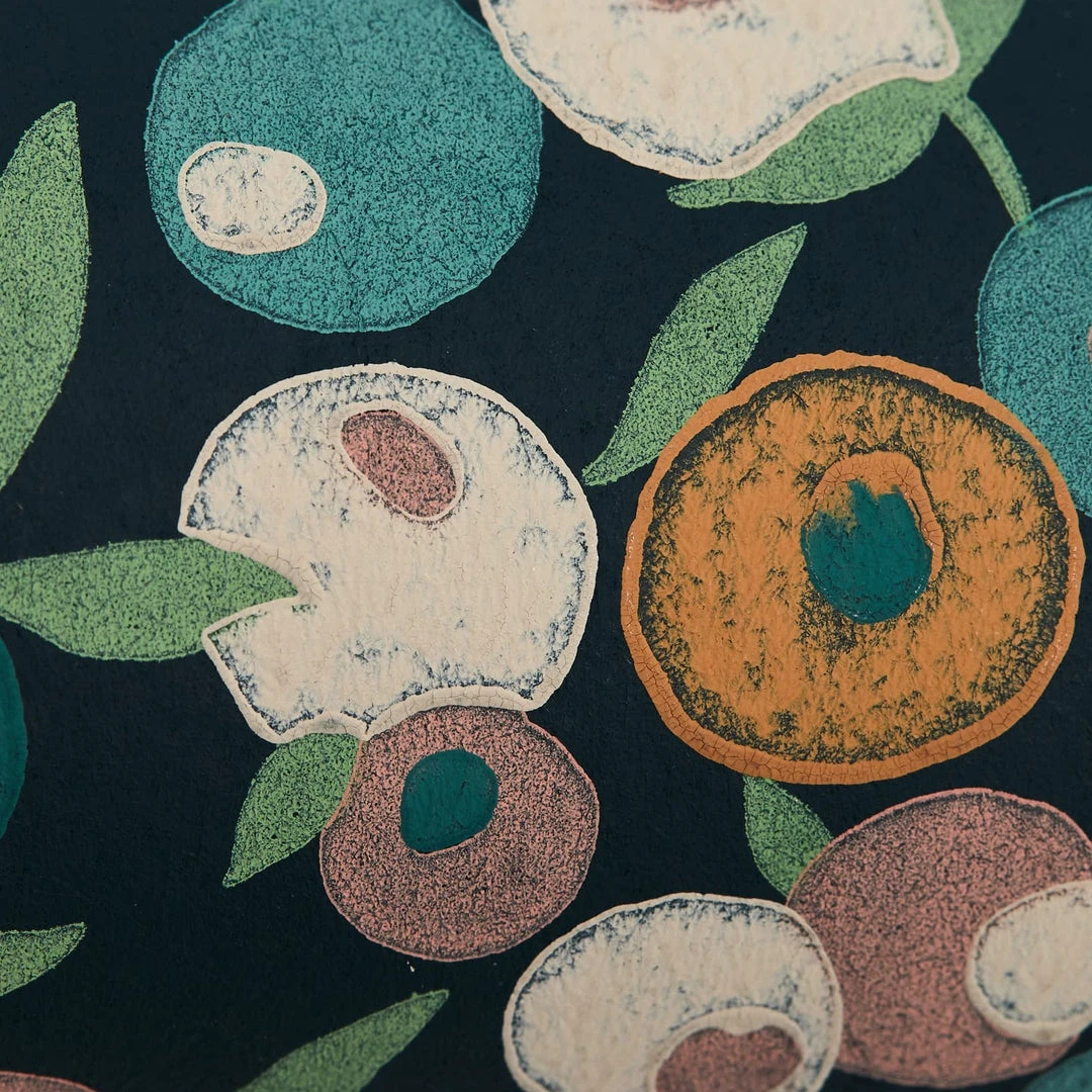 Wiltshire Blossom, the most iconic 1930s leaf-and-berry Liberty print is repainted and re-engineered into a contemporary furnishing design. It is printed using a hybrid technique which allows both flat colour and raised reticulated pigment to sit side by side, providing a beautiful tactility and clarity of print mark, rendered in both matte and metallic pigment.