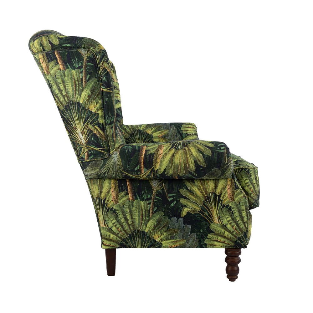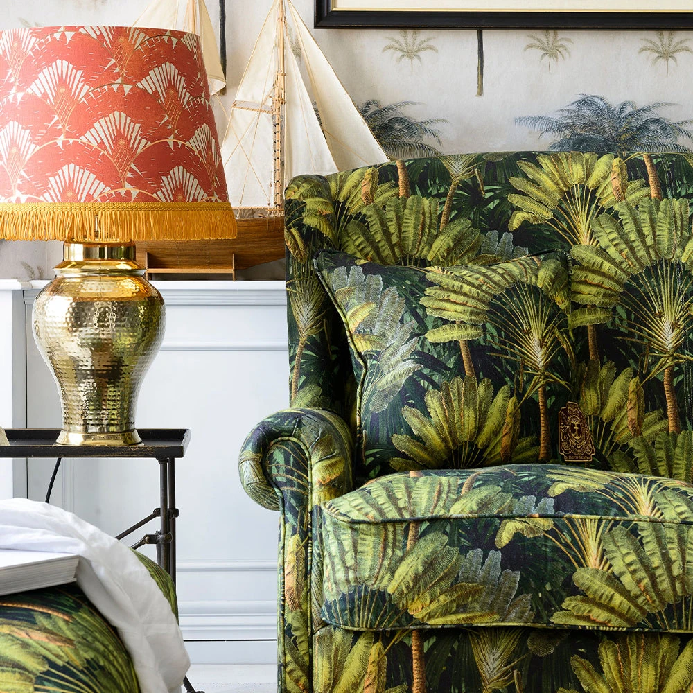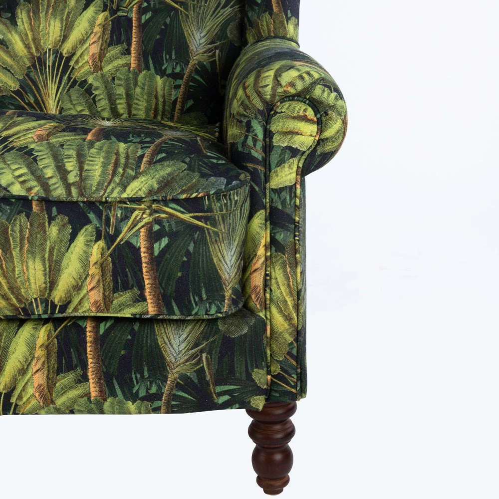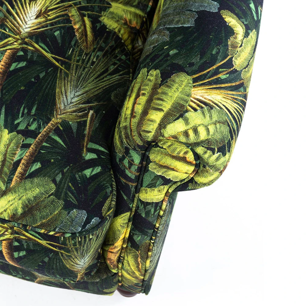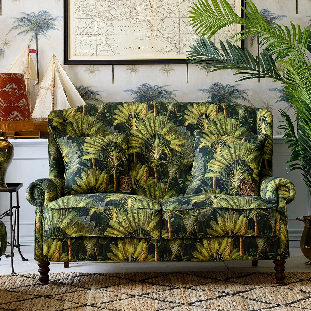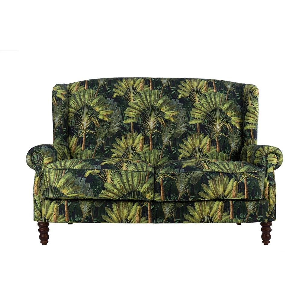 Mind the Gap’s collection of whimsical fabrics continues into this eclectic offering of furniture. This statement two seater sofa is with one piece large upright back , slight rollover arms, and a deep two- cushion seat. Up to date and whimsical in our Traveller’s Palm Linen. Sited on short turned legs. Rich tones of greens and brown highlights. Perfect for the tropical Havana Tropicana look.    Â