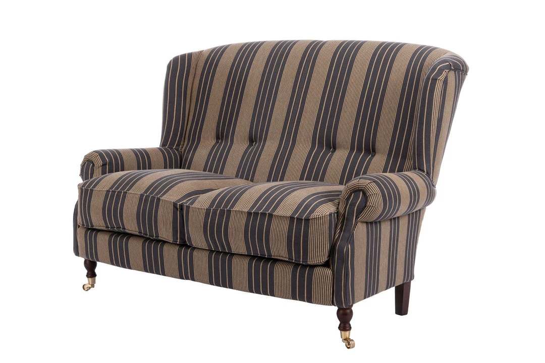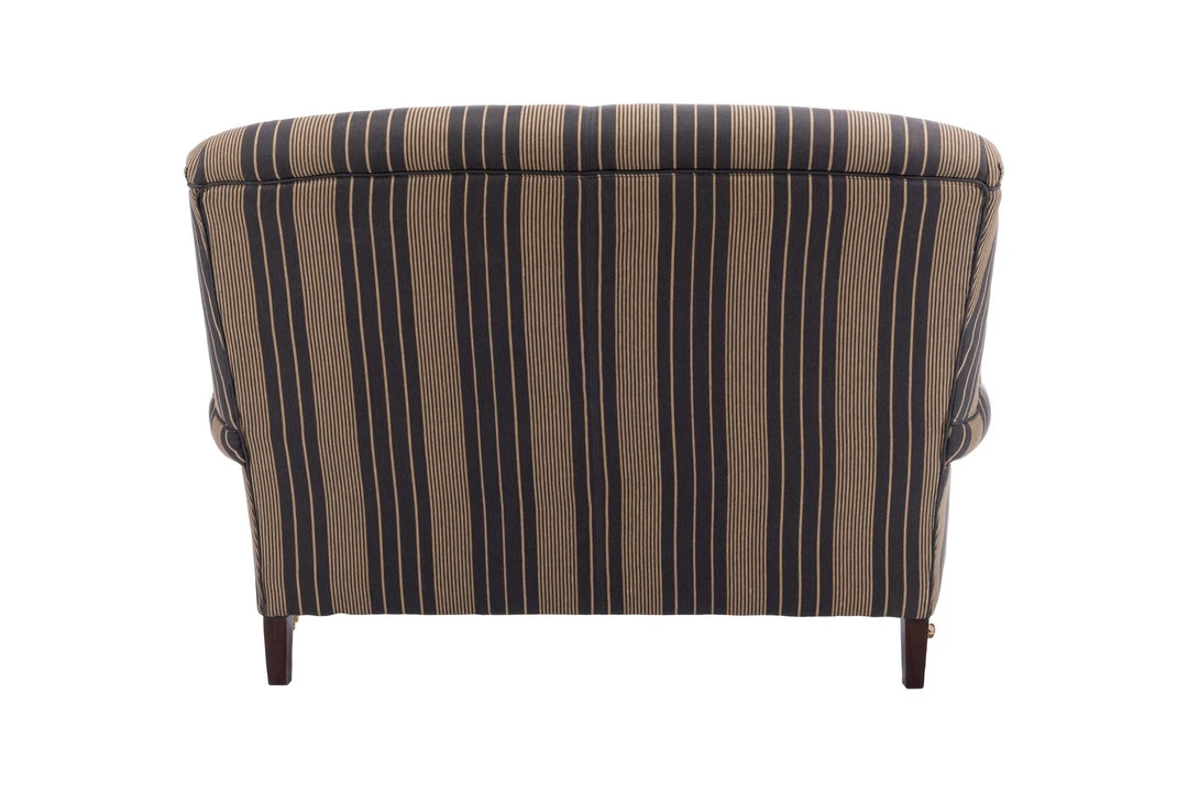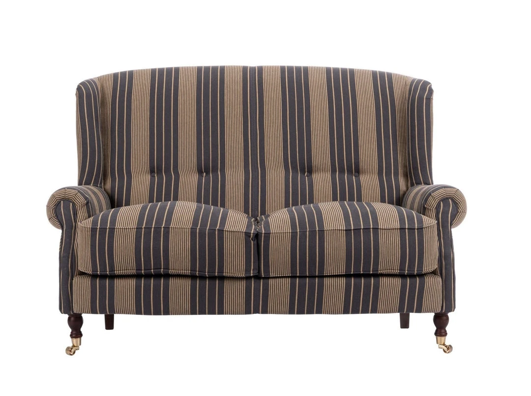 A statement for comfort sofa with one piece large upright discreet-buttoned back, slight rollover arms and a cozy, deep two-cushioned seater. Seated on distinctive tapered cherry brown legs, ABIGAIL is combining the timeless design with comfort, being a perfect choice for the living room. The sofa achieves a more authentic look through its carefully selected golden fringes secured with brass rivets.