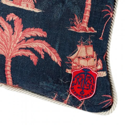 The wonderful island-life details ooze calm holiday vibes through the AEGEAN DARK Linen Cushion design. Printed front and back with the same pattern design, the cushion is finished with an off white rope border all around and an embroidered marine crest on the lower right corner. The cushion comes with feather filling.