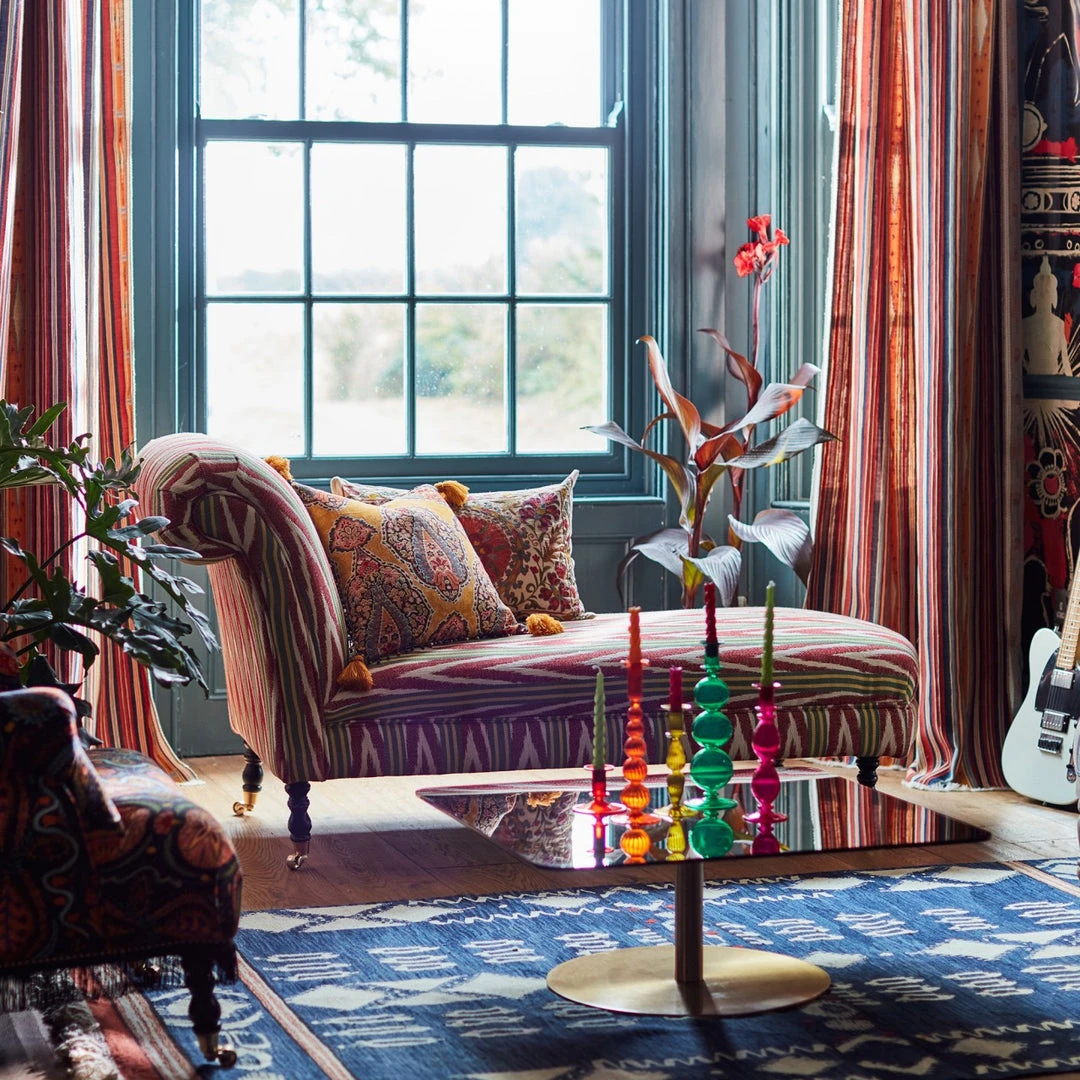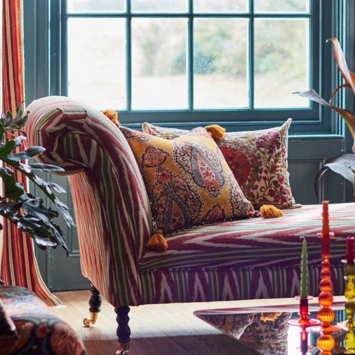Mind The Gap Anatolia Chaise Lounge – Bohemian Bakhmal Ikat Woven Fabric, Indigena Collection