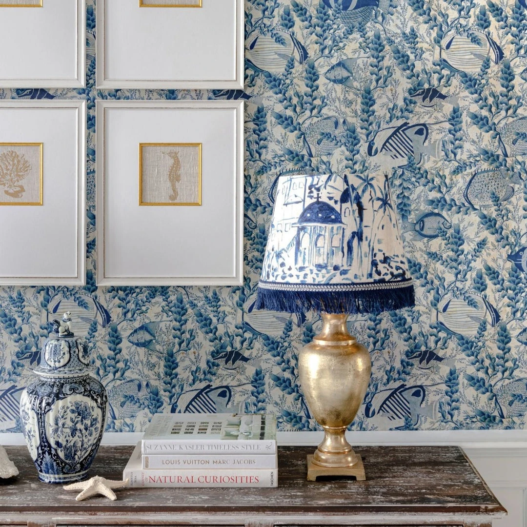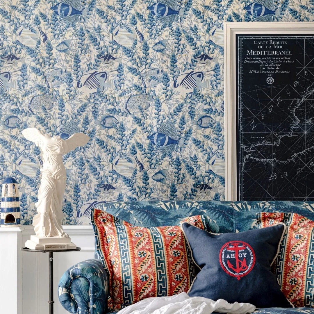 • Elevate your home decor with the Mind The Gap Aquarium Indigo Wallpaper, part of the exclusive Blue Skies Ahead Collection. This stunning wallpaper features a captivating design inspired by the beauty of nature and aquatic life.