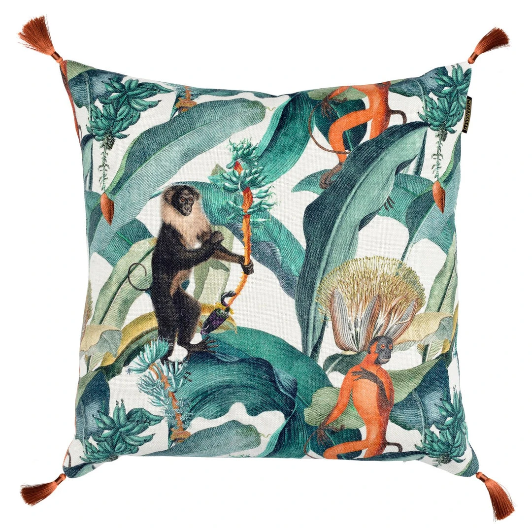 A tropical design on a white background featuring the magnificent wildlife and vegetation of the Bermuda islands. Natural linen finished with assorted piping, tassels and 100% duck feather filling. Â