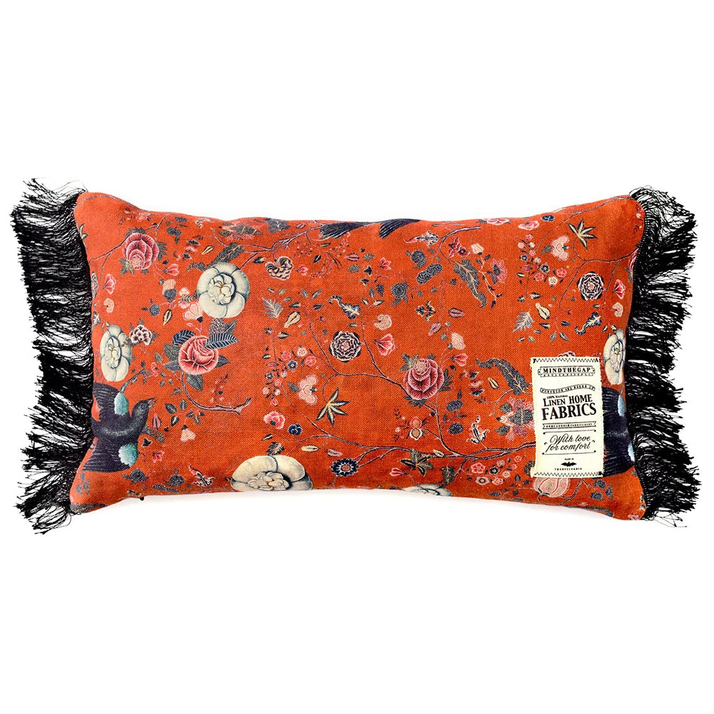 A rich tapestry like pattern on a red background with spectacular floral motifs. Inspired by the Bohemian lifestyle. Mysterious and opulent with fringe trimming on two sides. Stonewashed linen and 100% duck feather filling.