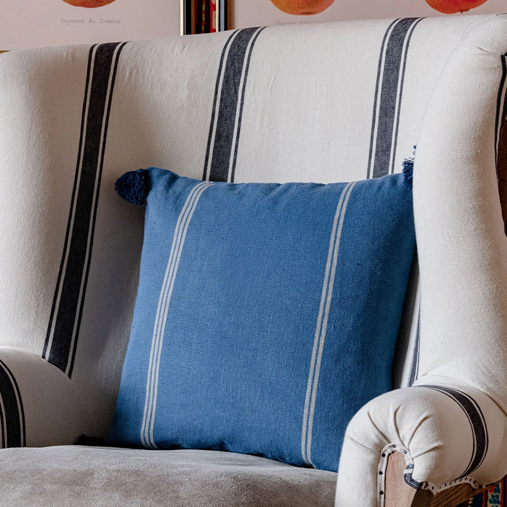 Our distinctive cushions show beautiful patterns and details of our fabrics. Made of heavy linen or cotton pile velvet all cushions are printed in England using traditional methods. Our cushions come with a variety of finishes such as fringes, tassels, pom-poms or printed borders adding little touches of luxury and uniqueness. Linens are stonewashed finished for softness and vintage effect.Â