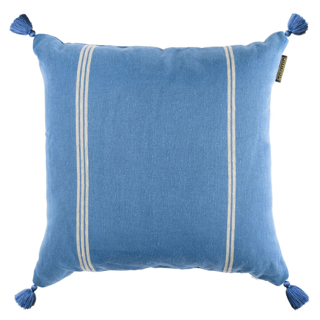 A provincial and royal blend, Katalin stripe is the expression of original Folk in patrician colours. Pattern on both sides and with ‘M’ monogram on the back. Hand finished with blue cotton tassels.