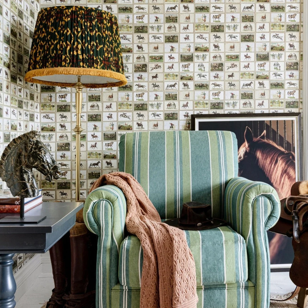 Decorate your walls with the English Equestrian Stamps wallpaper from Mind The Gap. Showcase your love for horse racing with this design, featuring small postage stamp pictures of graceful horses leaping, cantering, trotting through the beautifully painted English countryside. A perfect statement for any home. Easy to put up with the paste the wall application and will add a bit of quirk to any room whether it is one wall or all. This wallpaper is digitally printed using eco-friendly inks.Â