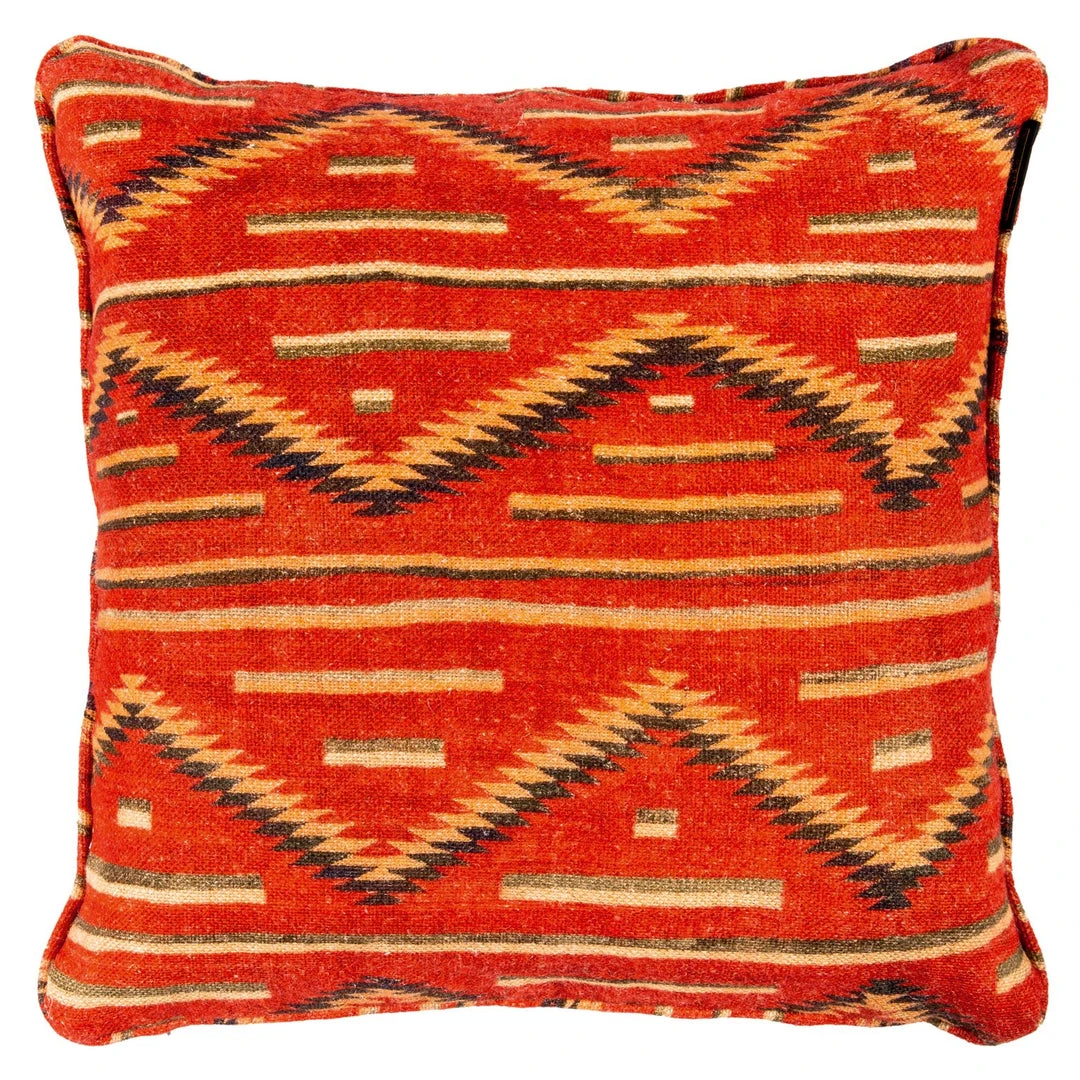Inspired by an original woven carpet pattern made by the Navajo people. A homage to the traditions and rich culture of one of the largest tribes on the North America Indians. Perfect for the modern farmhouse look. Rich in reds and jewel tones, finished with assorted piping and 100% duck feather filling.  Â