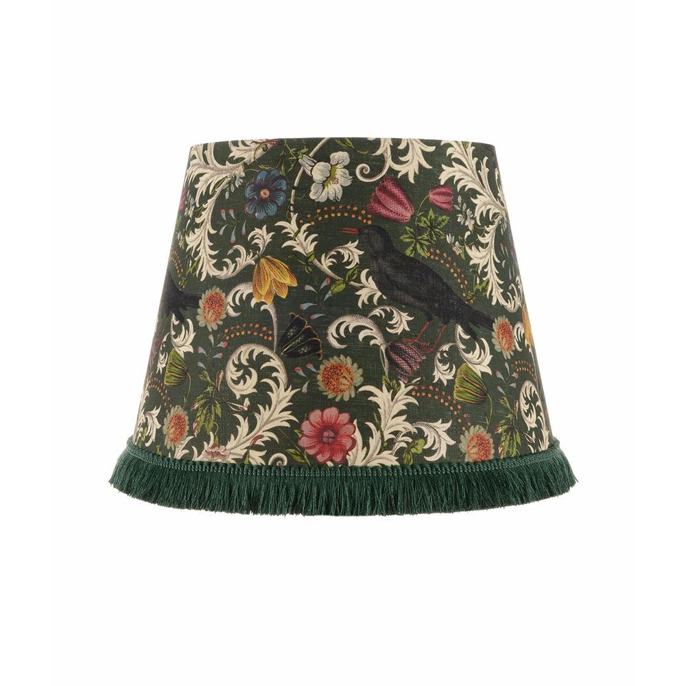 Rich Saxon vibes breeze through this printed linen cone shade, with the blackbird as a statement symbol on the top of an abundant flowery background. Finished with green fringes and golden metallic lining. Part of the Transylvanian Roots collection. Folk Couture at it’s finest.
