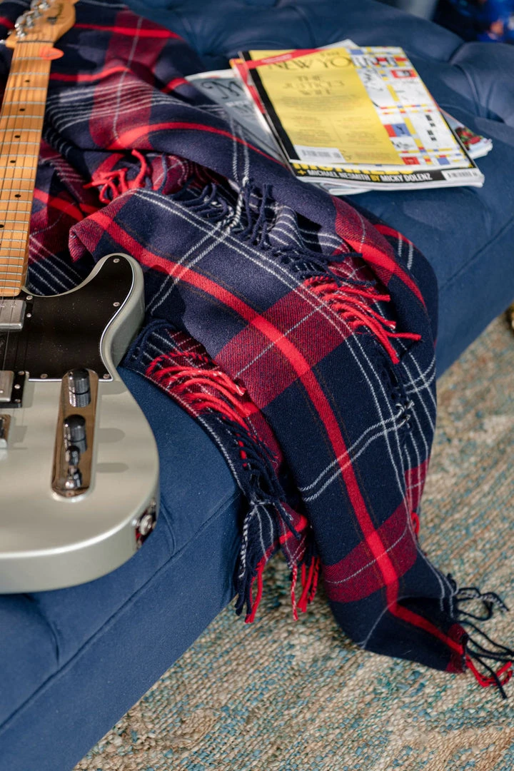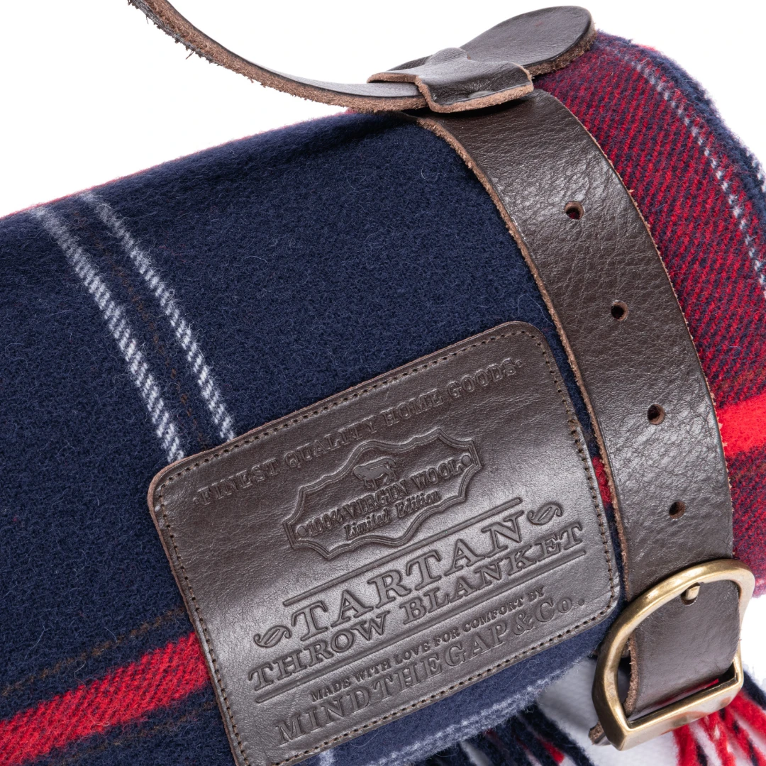 Made of the finest Italian virgin wool , this comfortable plaid throw is beautifully finished on the sides with delicate fringes and a vintage style artisan leather label. Made for both outdoor and indoor experiences, the blanket comes rolled up in a leather hand-crafted strap that makes it easy to carry and store in style. Brass rivets and buckles add value to this authentic accessory that combines design and comfort in a great way.