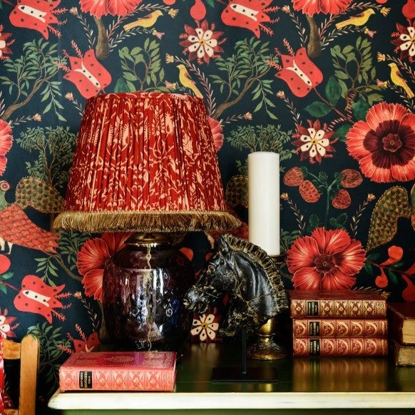 Bright blossoms highlight this Flowery Hungarian Folk pattern. Big flowers and folk birds stand out against a dark background creating a bold design. Folk Couture at it’s finest. Easy to put up with the paste the wall application and will add a bit of quirk to any room whether it is one wall or all. This wallpaper is digitally printed using eco-friendly inks.Â