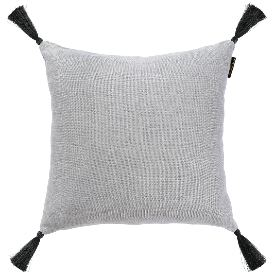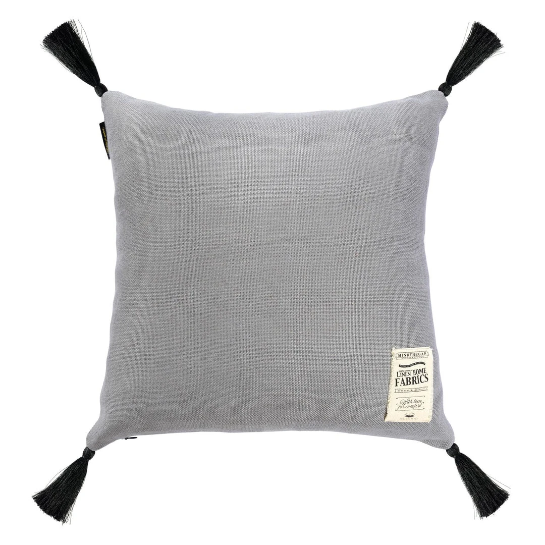 A plain cushion in our heavy FROST GREY linen highlighted by four black tassels. 100% duck feather filling.