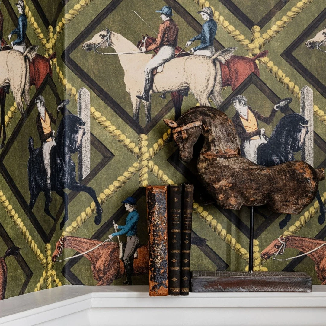 Surround yourself with the impactful Gymkhana wallpaper from Mind The Gap. An energetic design featuring horses and their owners cantering, galloping and jumping within the diamond shapes. Choose your favourite to win. Available in both khaki and grey. Easy to put up with the paste the wall application and will add a bit of quirk to any room whether it is one wall or all. This wallpaper is digitally printed using eco-friendly inks.Â
