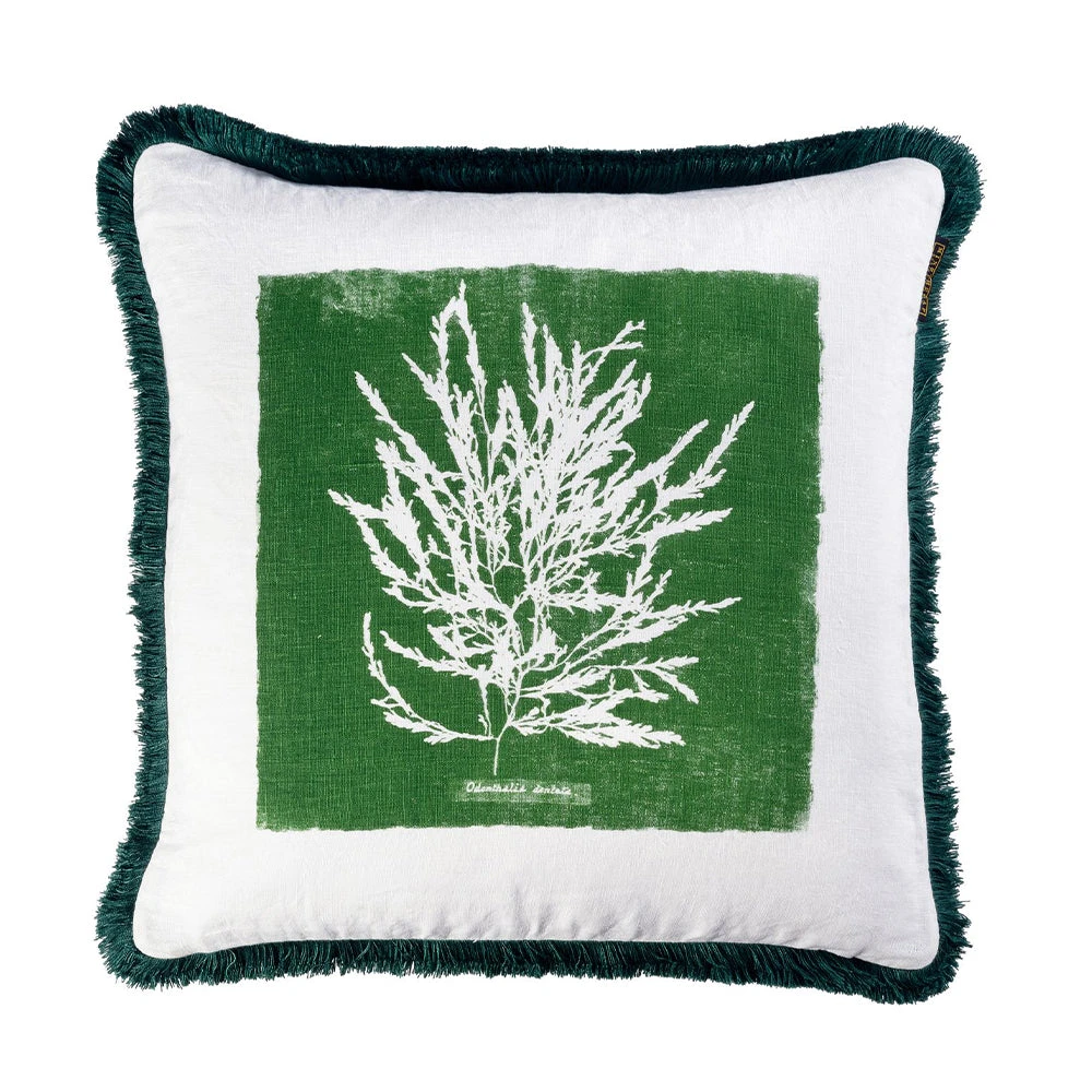 A fresh and bright looking cushion with a screen printed algae on one side, our PLAMERA CUBANA fabric on the other . Stonewashed heavy linen finished with fun green fringing detail and 100% duck feather filling. Â Â