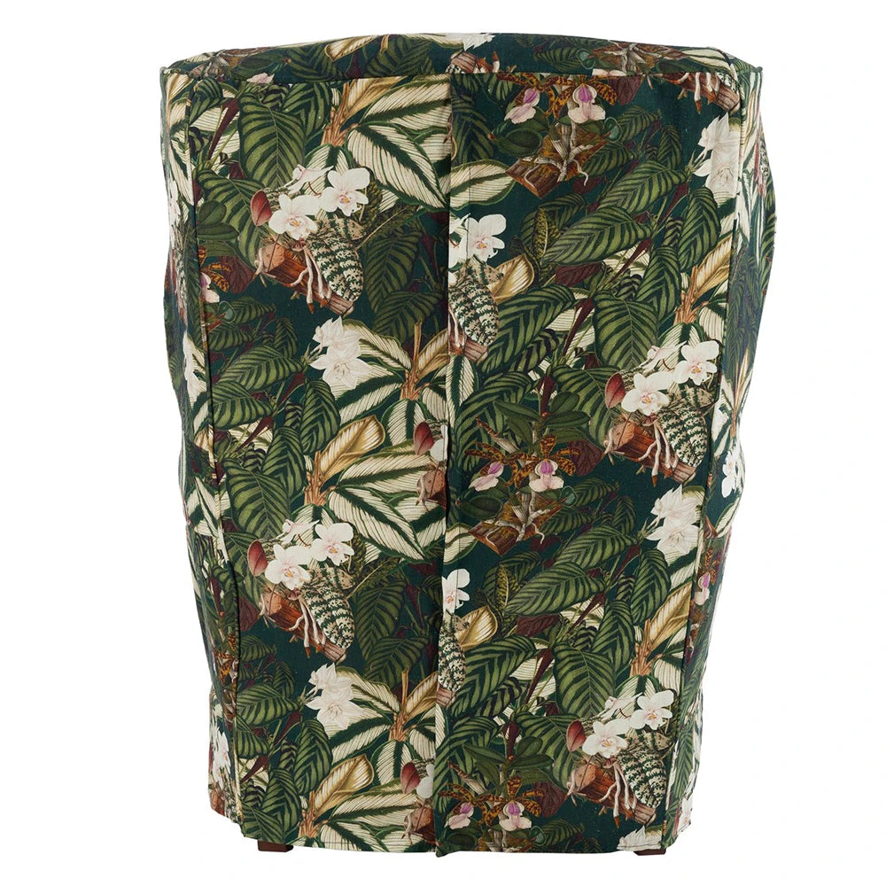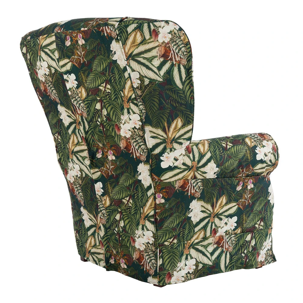 Mind the Gap’s collection of whimsical fabrics continues into this eclectic offering of furniture. Here the Neo-classic armchair silhouette is updated with bloom linen. A comfortable wing backed and rollover arms with cushioned seating. Sited on beechwood structure and tapered short legs. Upholstered with skirted cover.