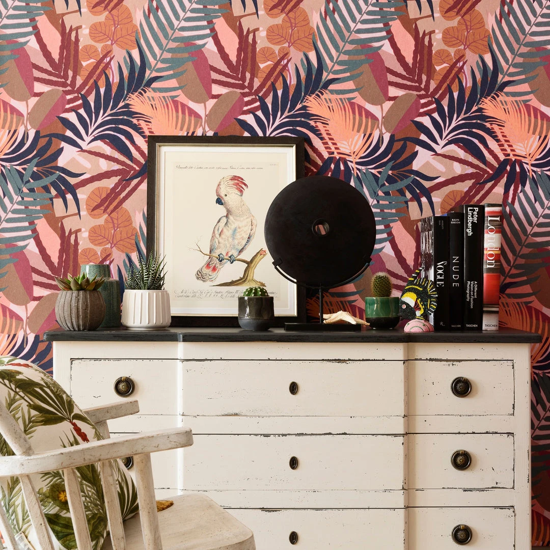 Decorate the walls with the Jardin Del Sol wallpaper from Mind The Gap. An abstract, vibrant wallpaper inspired by the gardens of Cuba. In this wallpaper, beautiful, tropical foliage sits upon a soft, pink background. The perfect wallpaper for adding intrigue and character into any room. Easy to put up with the paste the wall application and will enhance any room whether it is one wall or all. This wallpaper is digitally printed using eco-friendly inks. Available in both multi-coloured and monochrome green.Â