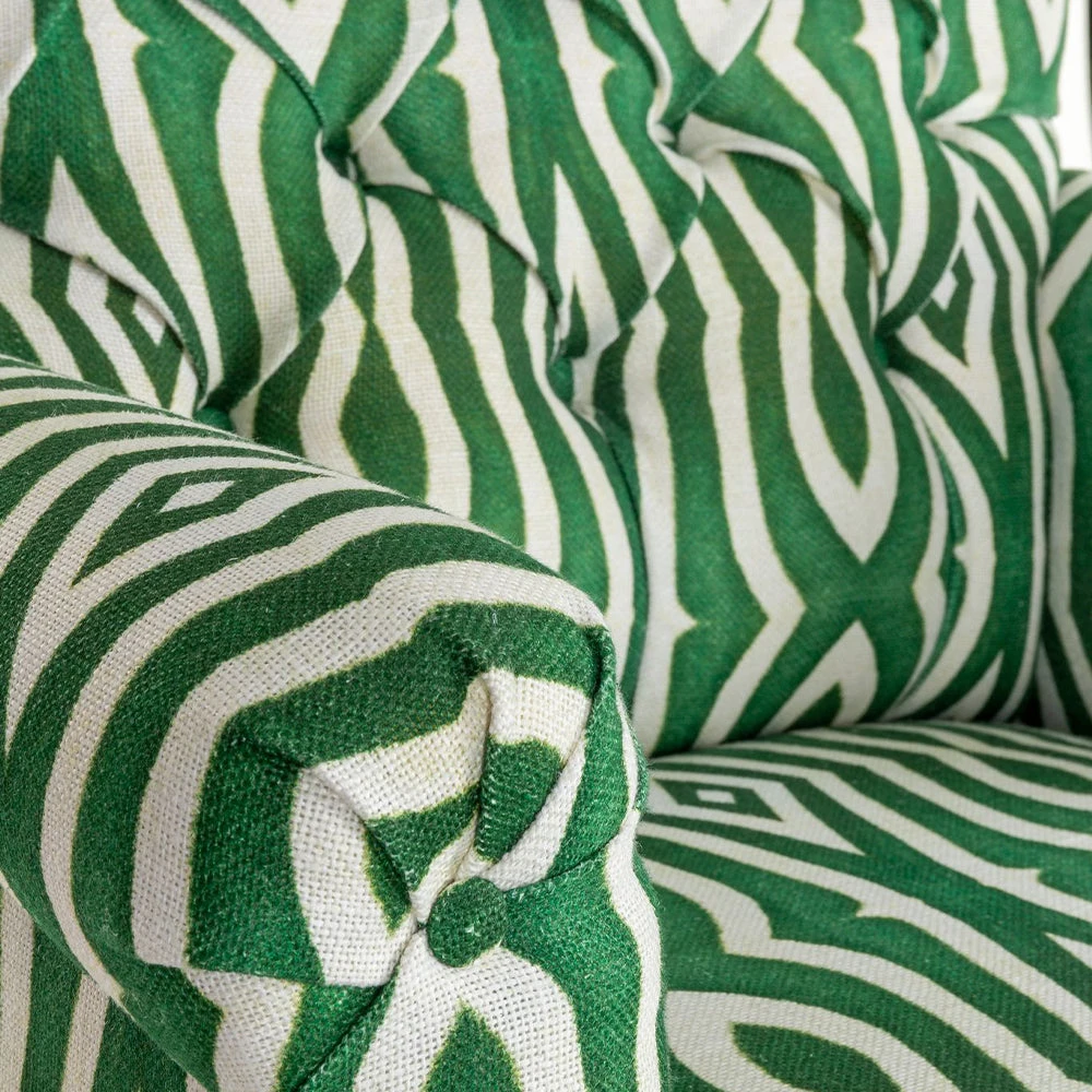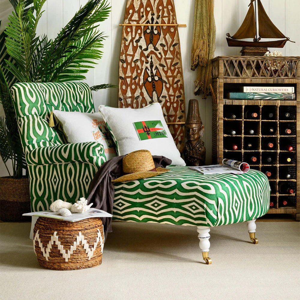 Mind the Gap’s collection of whimsical fabrics continues into this eclectic offering of furniture. The Madison Chaise in the graphic green & clean white RIVERSIDE 100% linen fabric.Β