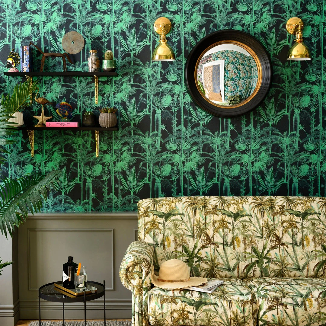 Decorate the walls with the Palmera Cubana wallpaper from Mind The Gap. Inspired by the Cuban Royal palm trees, this wallpaper brings the bright Caribbean sunshine into your home. The perfect wallpaper for adding intrigue and character into any room. Easy to put up with the paste the wall application and will enhance any room whether it is one wall or all. This wallpaper is digitally printed using eco-friendly inks. Available in both pink and a darker colour palette. Palmera Cubana is also available in a light green linen.Â
