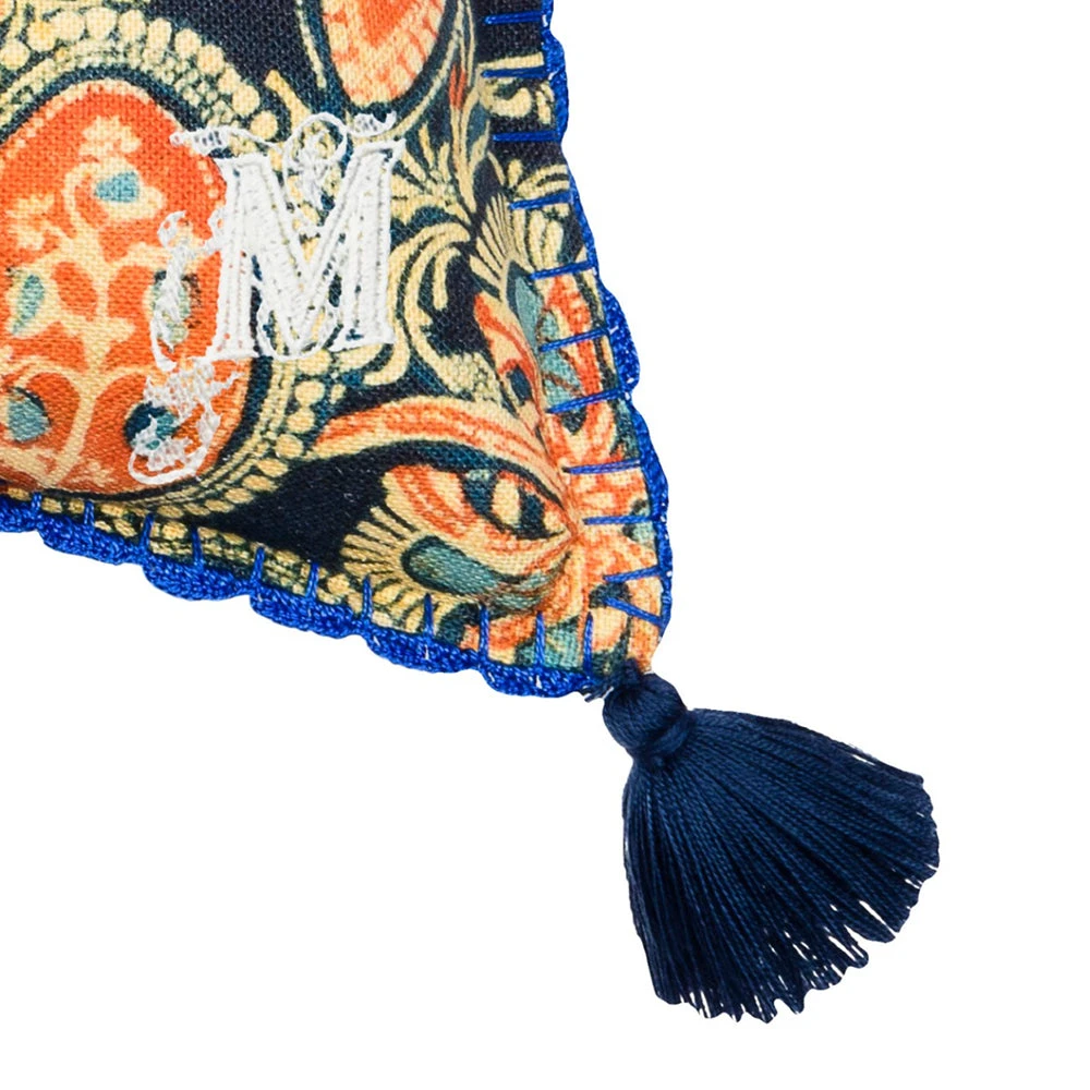 Heirloom retraces the fine details and nuances of our forbearers traditions and customs. Deep shades of blue and soft flowery shapes with rich oranges and teal. Full face pattern on both sides and ‘M’ monogram on the back. Finished with blue scalloped crochet trim and blue cotton tassels. Â