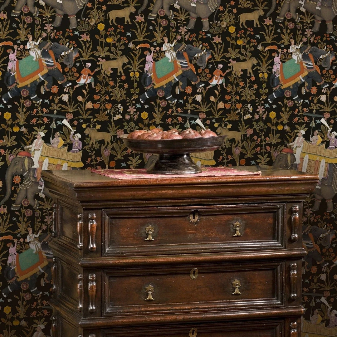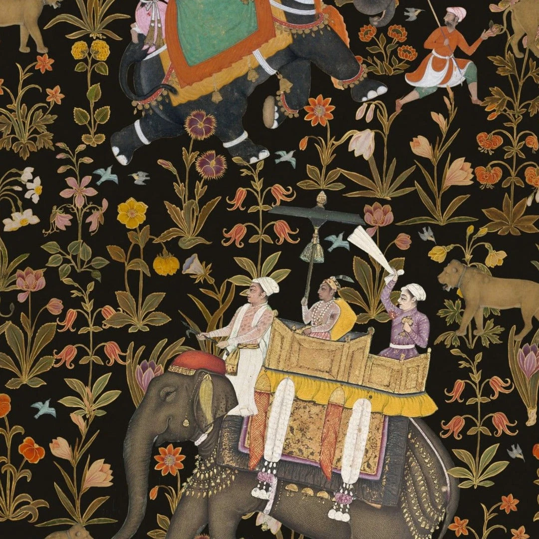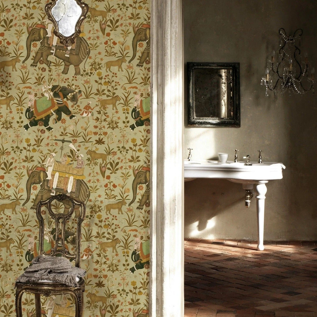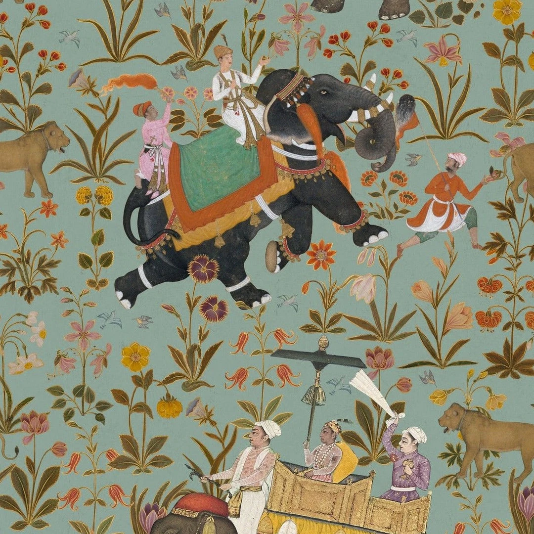 Adorn your walls with the Hindustan wallpaper from Mind The Gap. Inspired by the rich culture in India, Hindustan features glorious elephants travelling on a vibrant aquamarine backdrop. The sacred elephants of Hindu are surrounded by delicate foliage to create a truly beautiful statement that would be perfect on any wall. Easy to put up with the paste the wall application and will enhance any room whether it is one wall or all. This wallpaper is digitally printed using eco-friendly inks. Available in aquamarine, anthracite and soft olive green. Also available in a aquamarine linen.Â