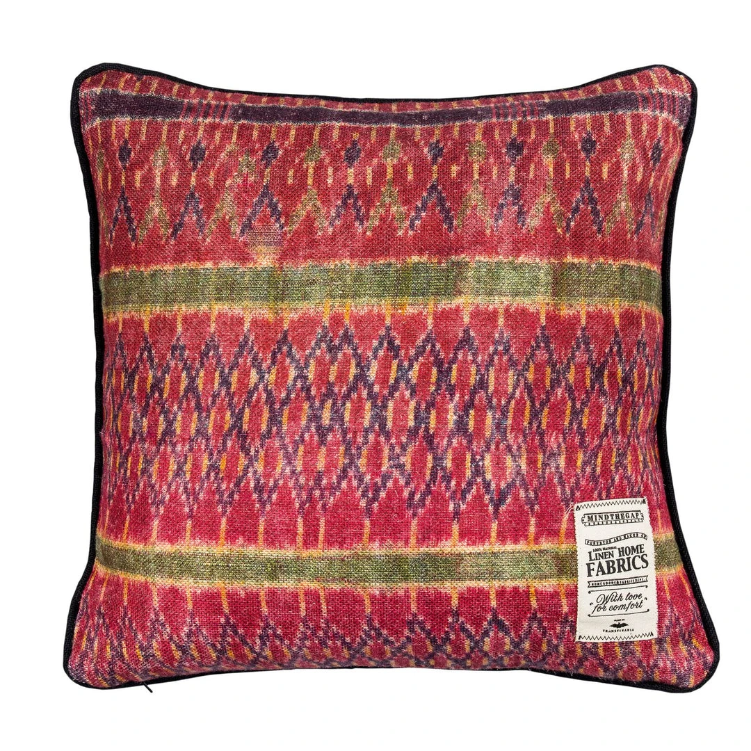 A beautiful handwoven pattern originally made by the nomadic people of Central Asia. Berry tones with green and purple-blue weave. Stonewashed linen finished with assorted piping and 100% duck feather filling.  Â
