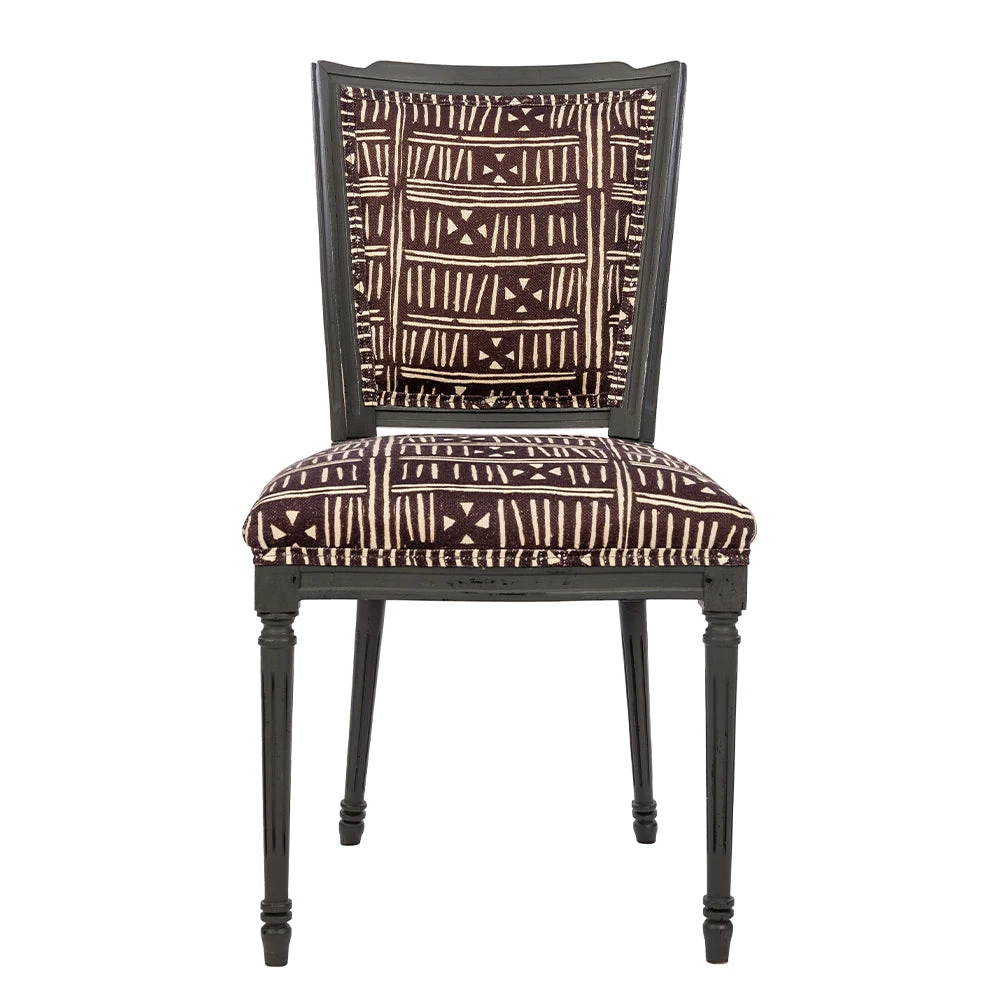 Mind the Gap’s collection of whimsical fabrics continues into this eclectic offering of furniture. A Neo-classic style dining chair upholstered in BOGOLANFINI linen with it’s graphic black and white pattern. Shaped with a slightly curved back and pointed wing tips, finished with decorated turned legs in a distressed paint.Â