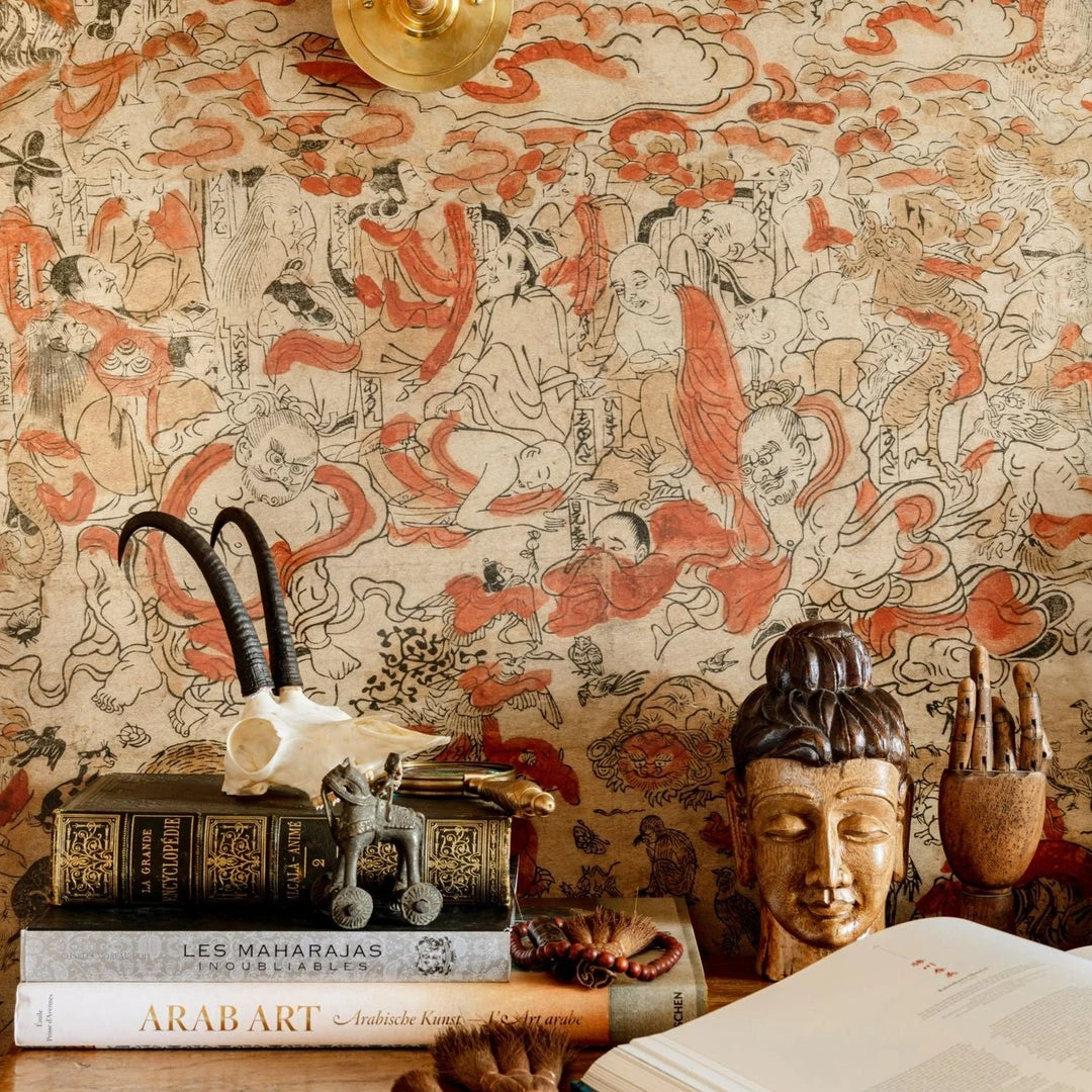 Decorate your walls with the mesmerising Spiritual Journey wallpaper from Mind The Gap. A design that reveals more details the closer you get to it. At a glance, this design looks like an abstract squiggle pattern, however look closely to find hand-drawn characters. A perfect statement for any contemporary and traditional home. Easy to put up with the paste the wall application and will add a bit of quirk to any room whether it is one wall or all. This wallpaper is digitally printed using eco-friendly inks. Printed across three rolls to maximise the pattern repeat.Â
