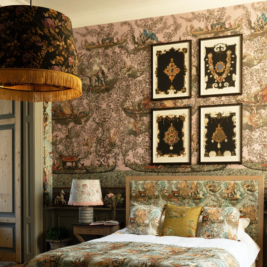 Adorn your walls with the Journey to Eden wallpaper from Mind The Gap. This Renaissance-style wallpaper is inspired by the engravings of angels and Gods by German Artist Johann Georg Wolfgang in the 1700s. The perfect wallpaper for adding depth and intrigue into any room. Easy to put up with the paste the wall application and will enhance any room whether it is one wall or all. This wallpaper is digitally printed using eco-friendly inks. Printed over three rolls to maximise the pattern repeat. Available in both pink and dark. Also available in a blue linen.Â