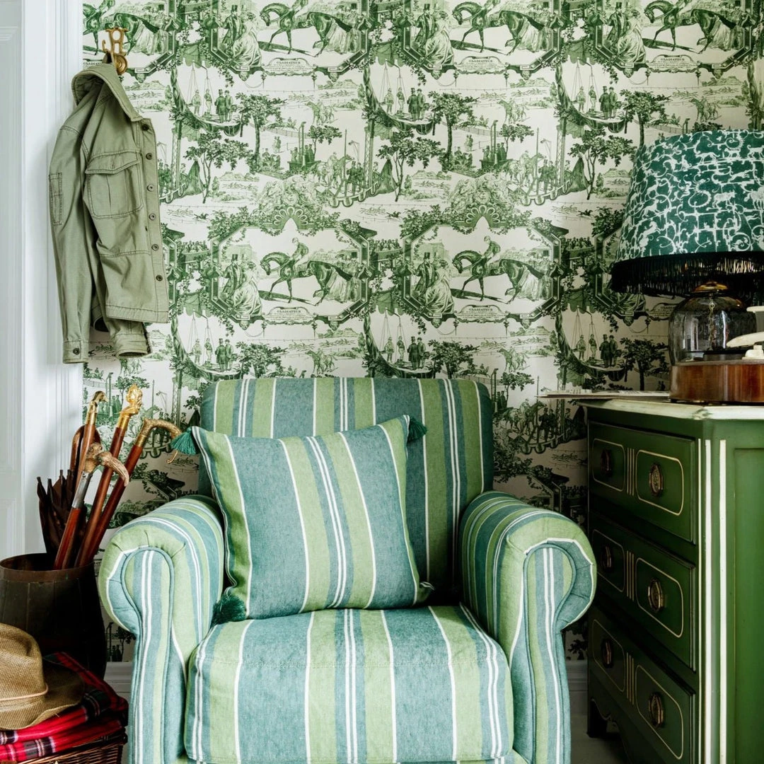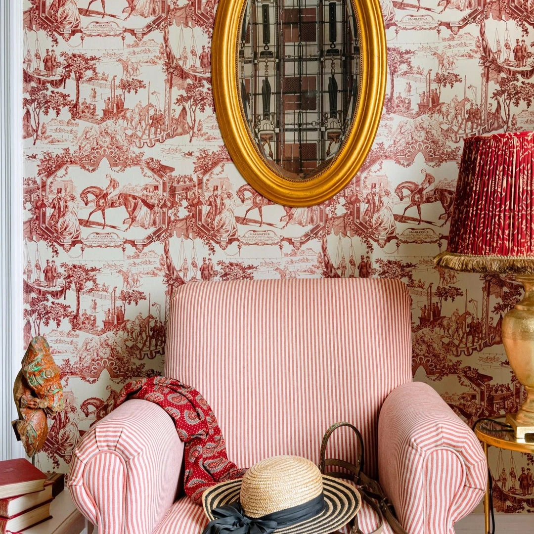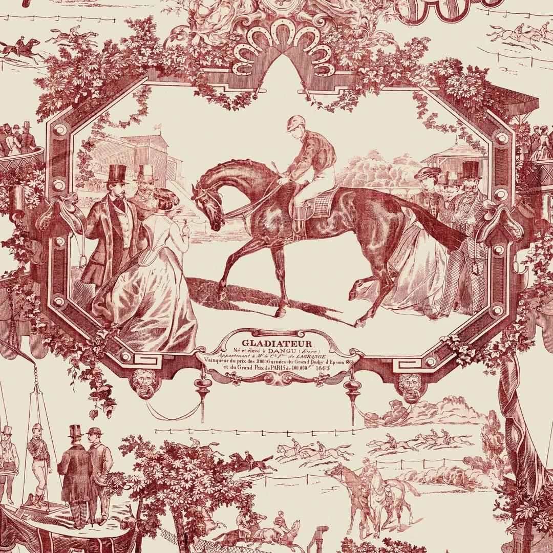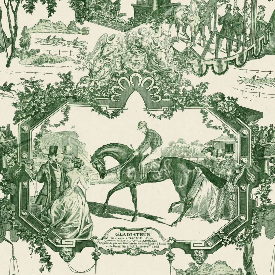 Surround yourself with the beautiful Grand Prix wallpaper from Mind The Gap. Influenced by the French Toile de Jouy patterns, this design depicts a day at the race course. Find delicate and intricate details, all hand illustrated to achieve a special and impactful statement for any interior, both traditional and contemporary. Available in both green and smokey red. Easy to put up with the paste the wall application and will add a bit of quirk to any room whether it is one wall or all. This wallpaper is digitally printed using eco-friendly inks.Â