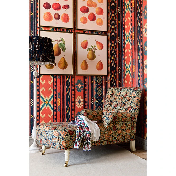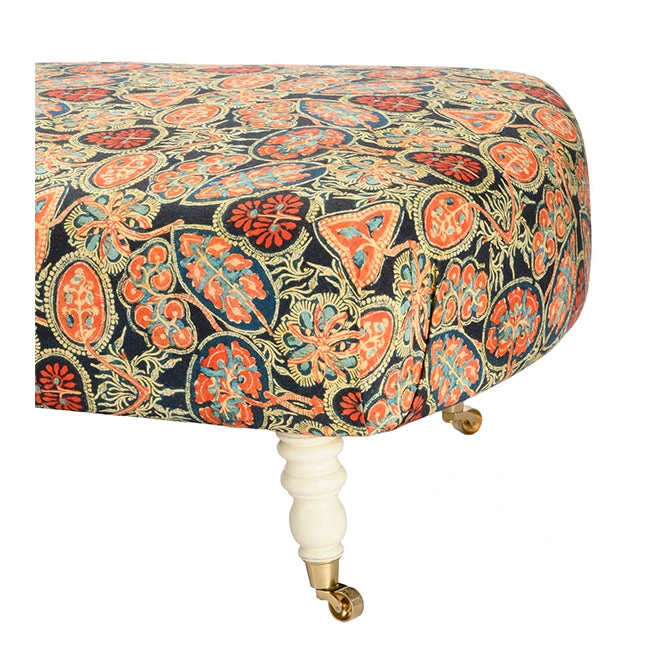 Mind the Gap’s collection of whimsical fabrics continues into this eclectic offering of furniture. This statement chaise features rollover arms and a sophisticated silhouette by the tufted backrest adding both elegance and function to your space. Crafted from beechwood and upholstered with a soft foam filling. Tapered grey washed legs and gold castors.