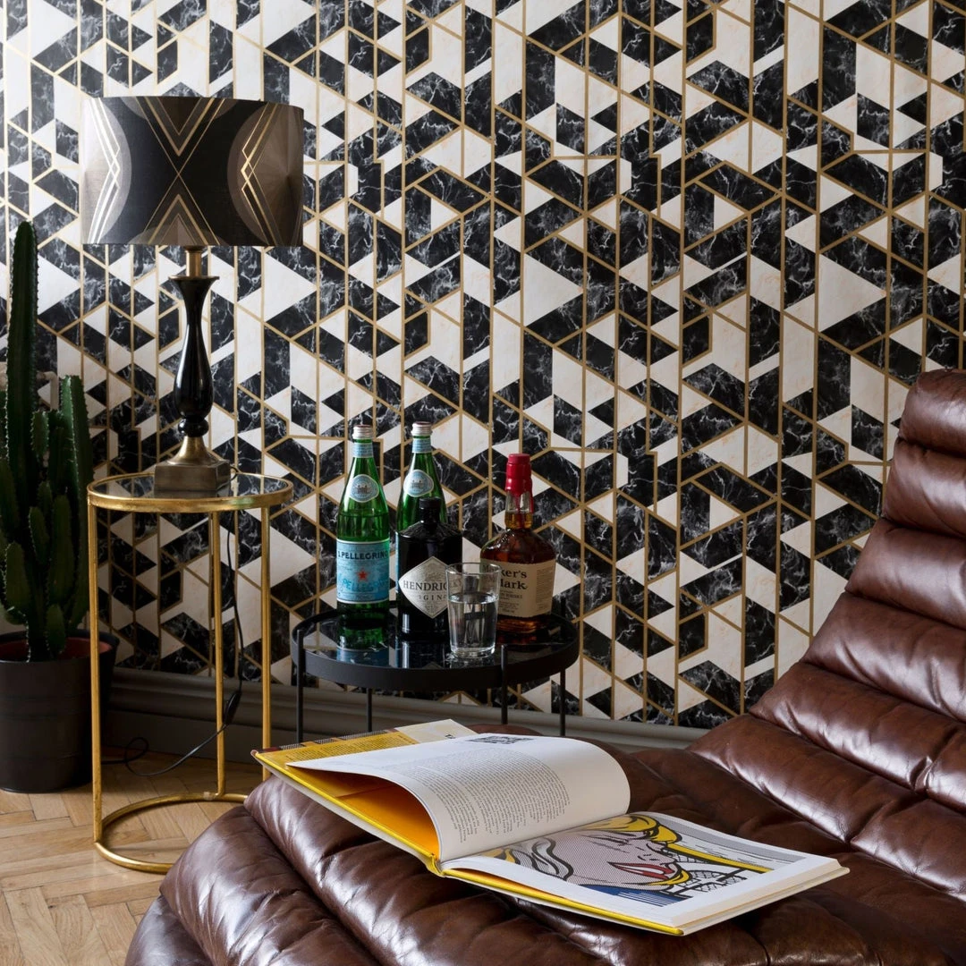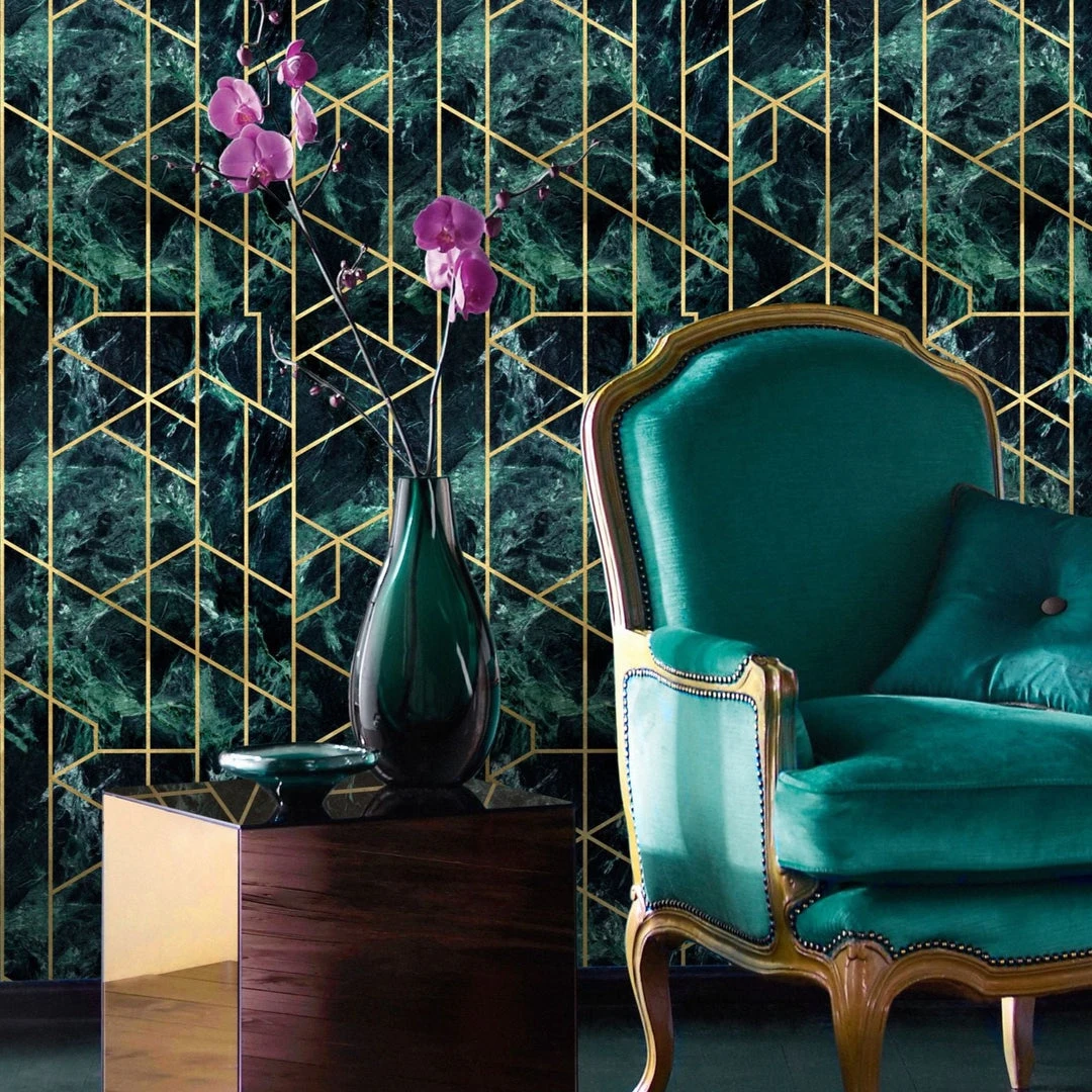 Adorn your walls with the ornate Gramercy in Emerald wallpaper from Mind The Gap. Featuring emerald marble with intricate metallic geometrics, this art-deco inspired wallpaper will be sure to make an opulent statement in any space. It is easy to put up with the paste the wall application and will add a bit of quirk to any room whether it is one wall or all. Available in emerald, onyx and ivory.Â
