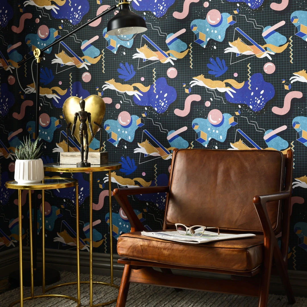 Surround yourself with the Modern Foxy wallpaper from Mind The Gap. A futuristic design featuring a fox leaping through geometric shapes in this surreal print. Enjoy the graphic qualities and bold colours and make a fun statement. Easy to put up with the paste the wall application and will add a bit of quirk to any room whether it is one wall or all. This wallpaper is digitally printed using eco-friendly inks.Â