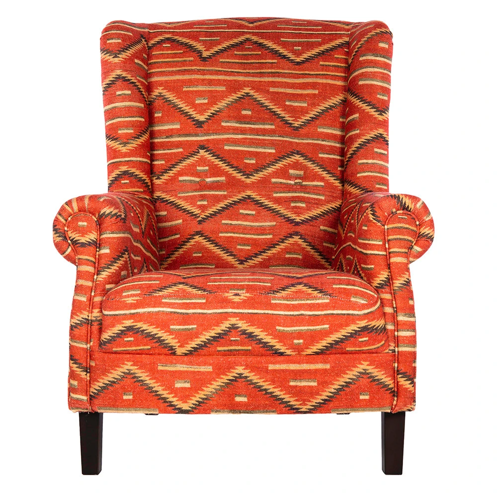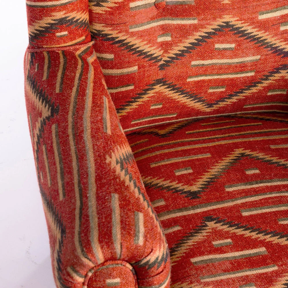 Mind the Gap’s collection of whimsical fabrics continues into this eclectic offering of furniture. Here the classic armchair silhouette is updated with EYEDAZZLER NAVAJO linen from our INDIGENA collection . A strong traditional pattern with nods to the Navajo weave traditions. Tones of black ,red and yellow. A perfect accent for the modern farmhouse. Â Â
