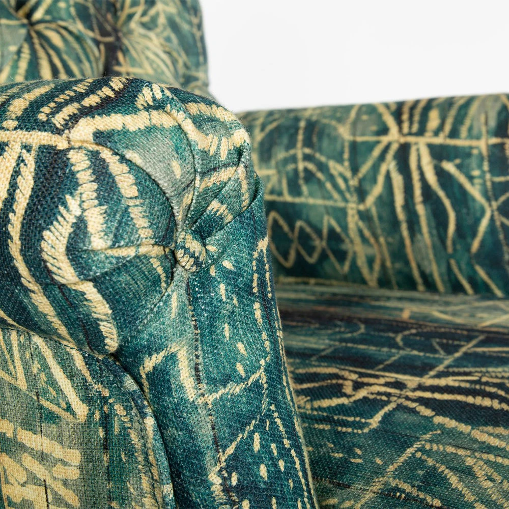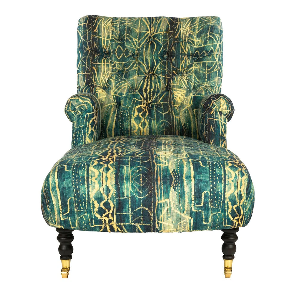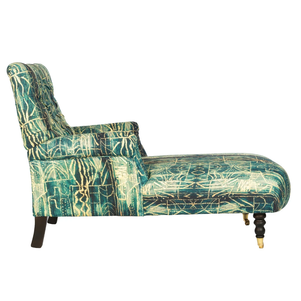 Mind the Gap’s collection of whimsical fabrics continues into this eclectic offering of furniture. This statement chaise features rollover arms and a sophisticated silhouette by the tufted backrest adding both elegance and function to your space. Crafted from beechwood and upholstered with a soft foam filling. Tapered grey washed legs and gold castors. BAMBILELE 100% linen in a rich cultural pattern, tones of Blue , Brown and yellow.Â