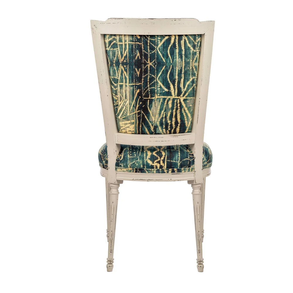 Mind the Gap’s collection of whimsical fabrics continues into this eclectic offering of furniture. A Neo-classic style dining chair upholstered in BAMILEKE Linen with it’s rich pattern of green , taupe and yellow . Shaped with a slightly curved back and pointed wing tips, finished with decorated turned legs in a distressed paint.Â