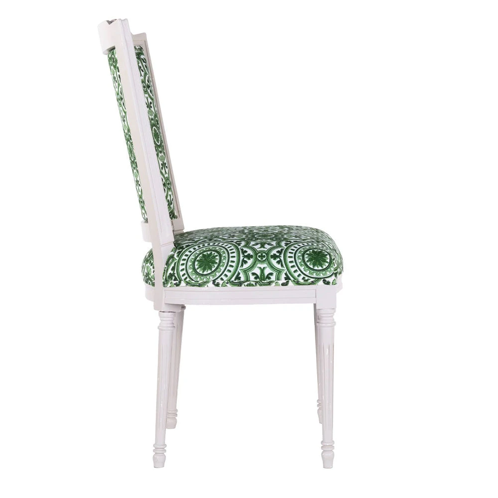 Mind the Gap’s collection of whimsical fabrics continues into this eclectic offering of furniture. A Neo-classic style dining chair upholstered in the green option of THE MANOR Linen. Shaped with a slightly curved back and pointed wing tips, finished with decorated turned legs in a distressed paint.Â