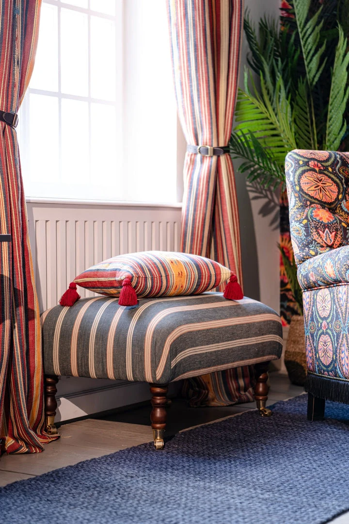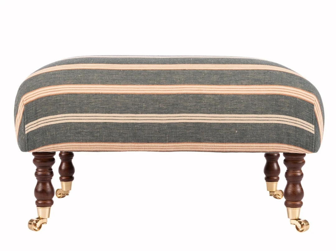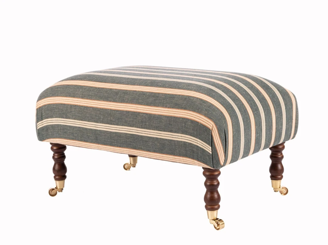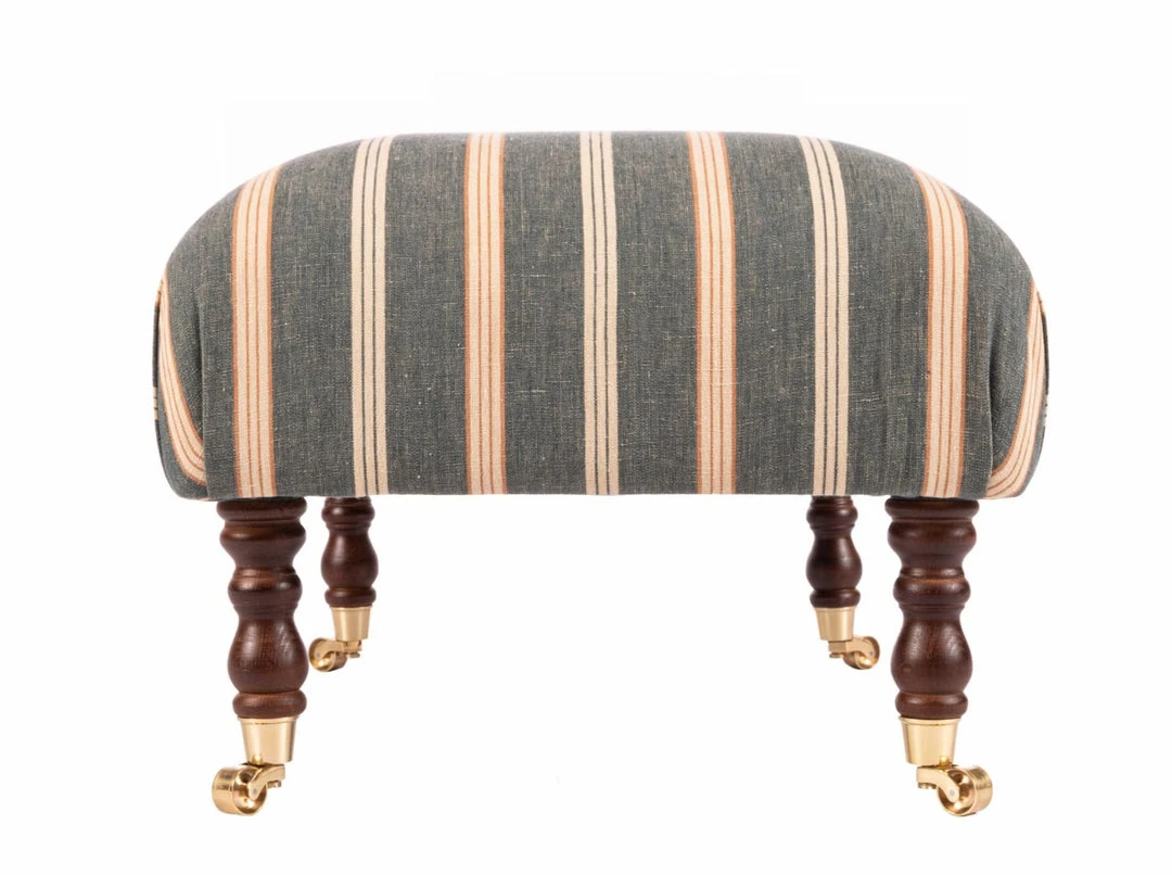 A piece-of-art ottoman with a cushioned seating, this HUDSON stool is dressed in OREGON STRIPES Washed Linen. The beautiful turned cherry brown legs are finished with gold castors.