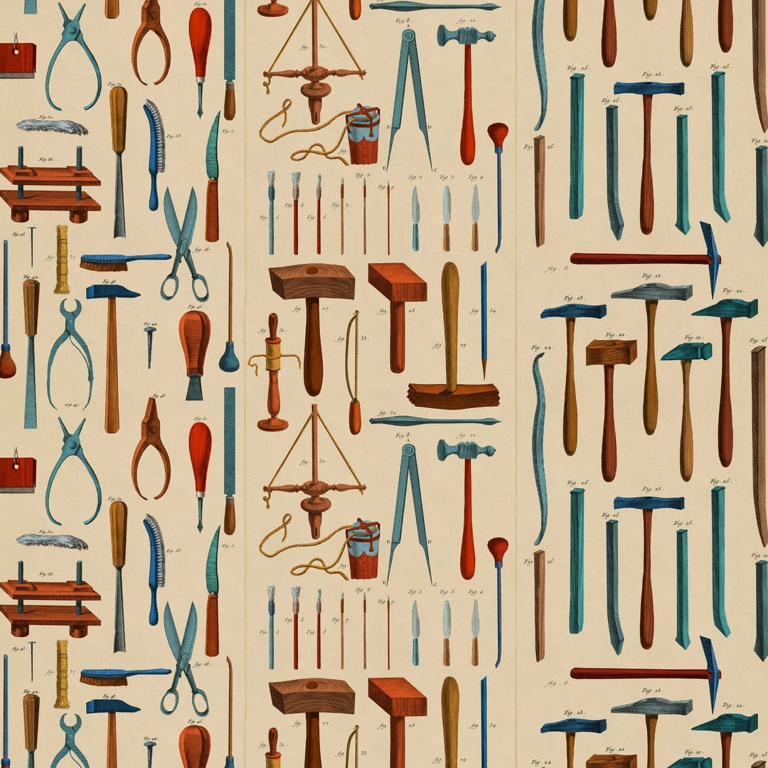 Mind The Gap Old Tools Anthracite Wallpaper – Comic & Themed Wallpaper for Home Decor