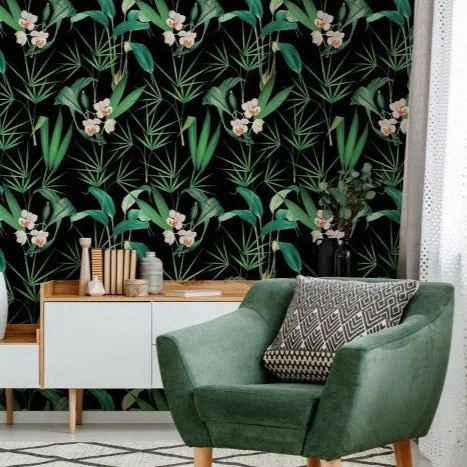 Make a statement with the Palm Springs Anthracite wallpaper from Mind The Gap. Featuring luscious plants on a dramatic black background, this wallpaper will be sure to add depth and colour to any wall. Easy to put up with the paste the wall application and will enhance any room whether it is one wall or all. This wallpaper is digitally printed using eco-friendly inks. Also available in Pink.Â