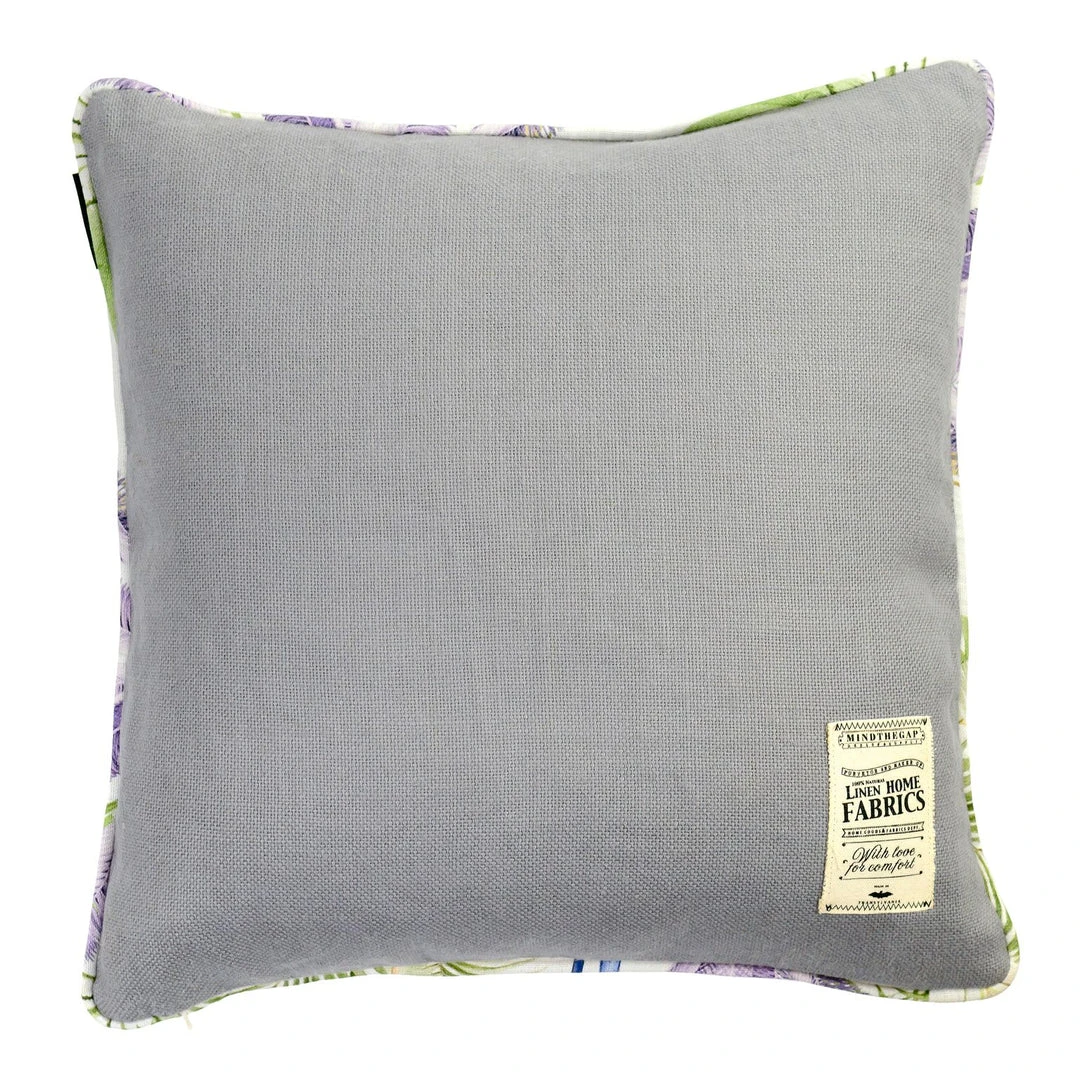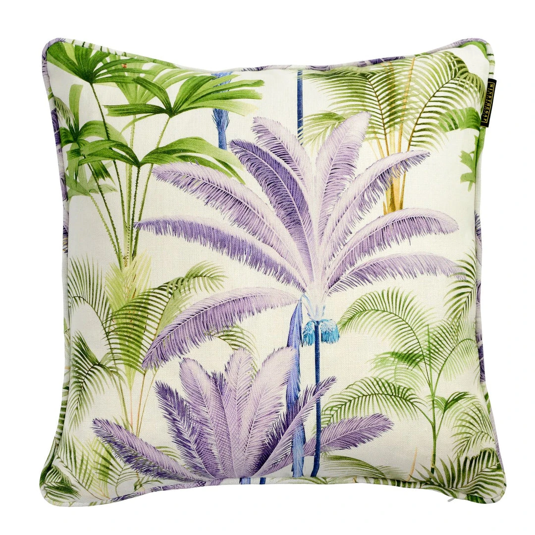 An exotic design of greens and pops of purple on a light background with impressive palm tress. Bringing the tropics to any room. Frost grey heavy linen on the back side. Stonewashed linen finished with piping and 100% duck feather filling.  Â