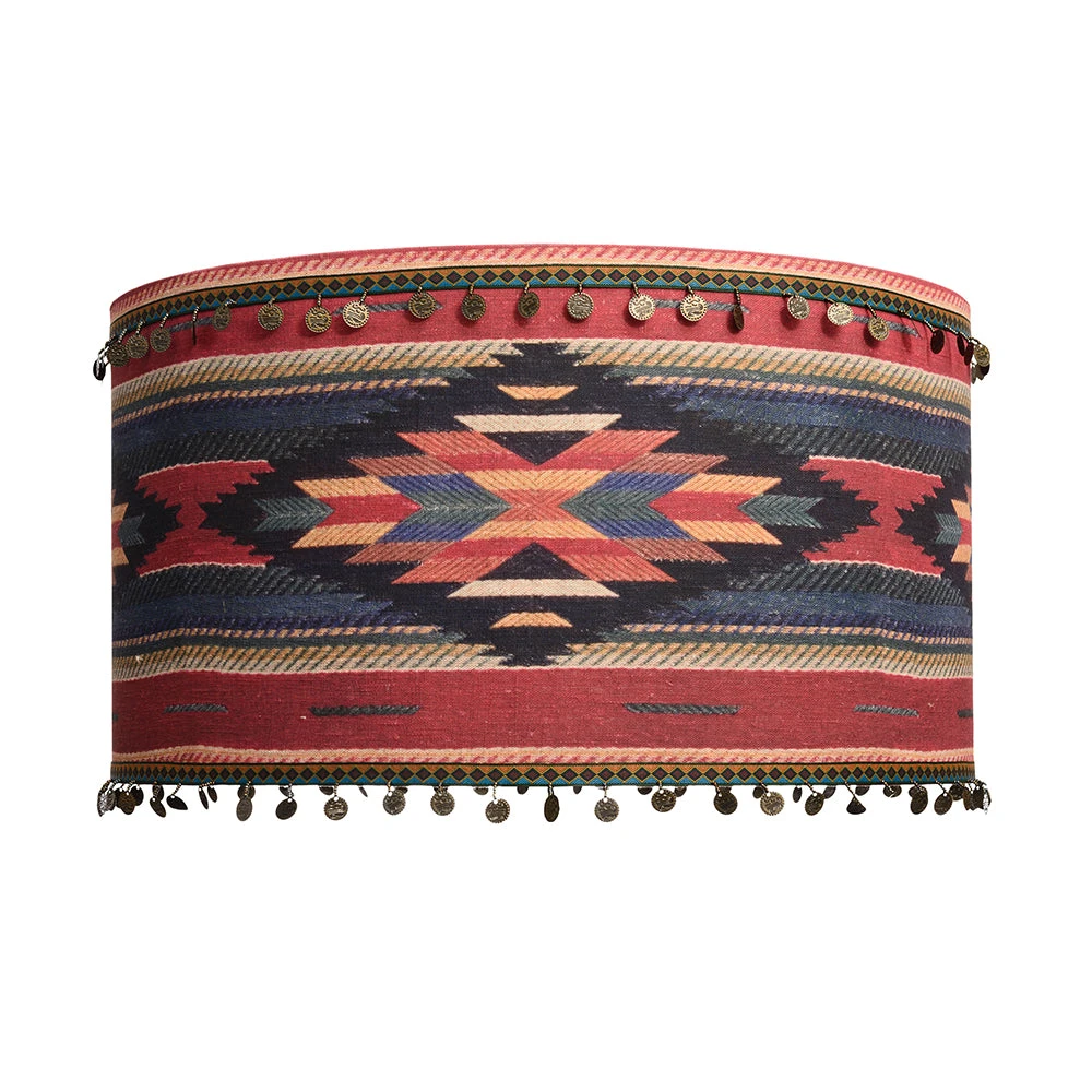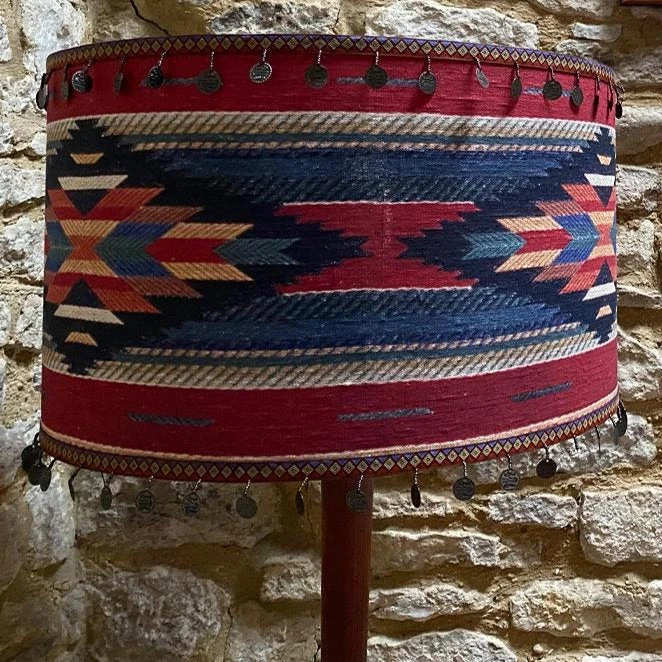A bold geometric weave design originating in South America with beautiful large scale pattern. Ribbon and copper coin tassel detailing, metallic gold lining.