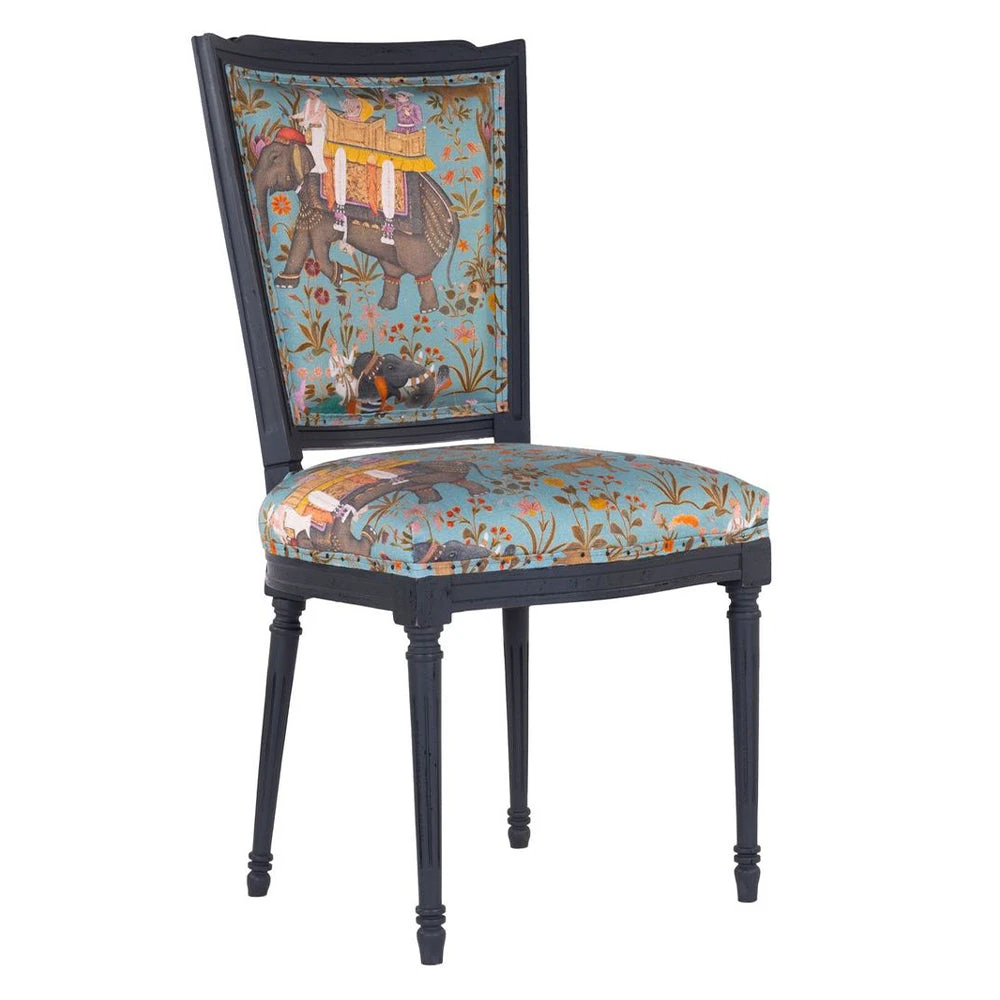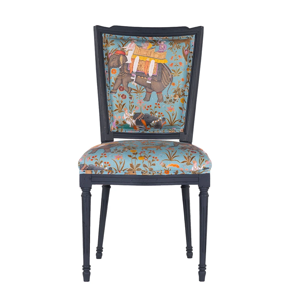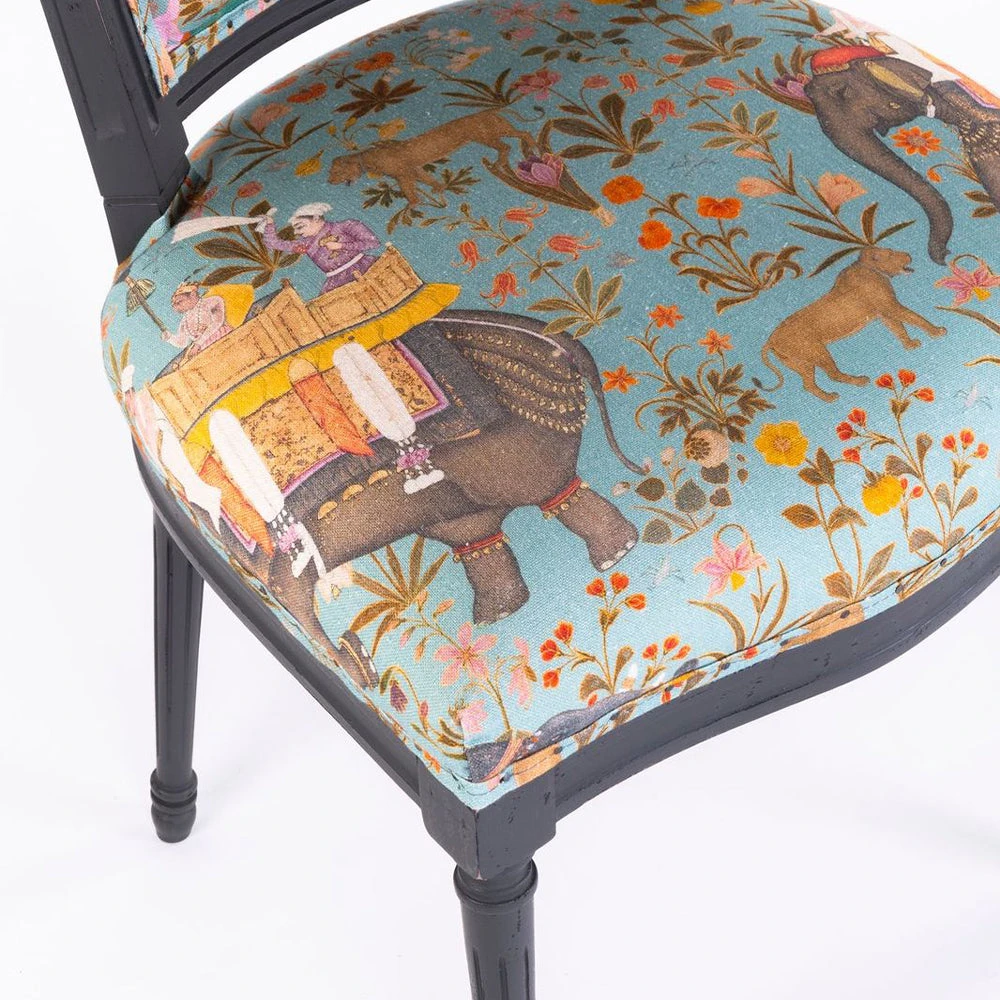 Mind the Gap’s collection of whimsical fabrics continues into this eclectic offering of furniture. A Neo-classic style dining chair upholstered in the green option of HINDUSTAN AQUAMARINE Linen. Shaped with a slightly curved back and pointed wing tips, finished with decorated turned legs in a distressed paint.Â